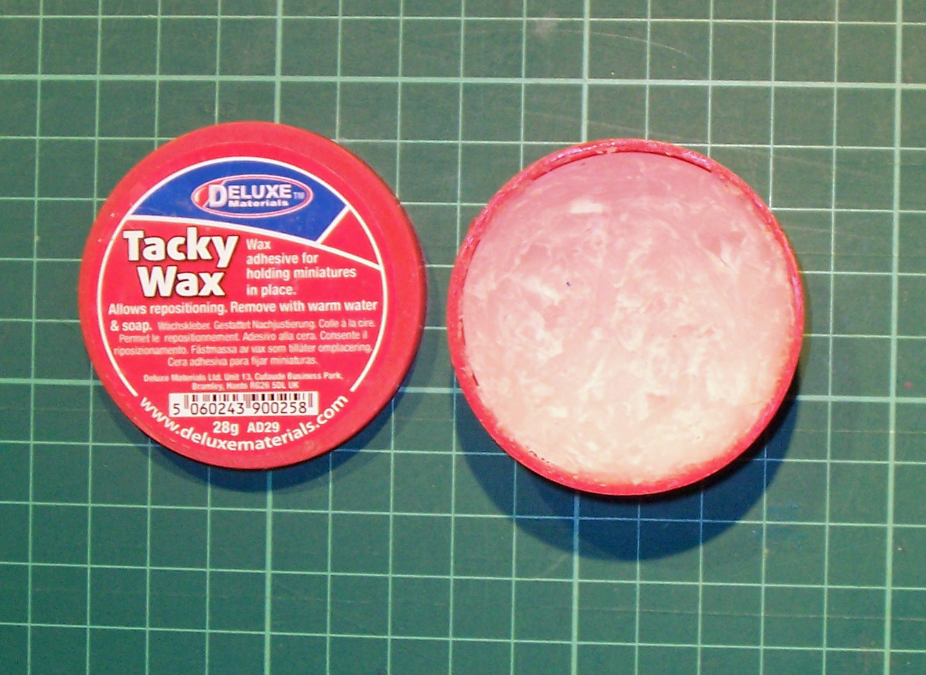 It is normally marketed for dolls house use but it can be used for a wide variety of things and its best use is for semi-permanently sticking down figures on your layout. All you need to do is gently scrape the feet of your figures into the pot so you have a small amount transferred and push them down onto the surface. It really is that simple. The advantage of using Tacky Wax over super glue is that it allows you to move the figures around at will, just lift and plonk them somewhere else. It can be used for buildings as well and can be removed with a little warm soapy water when necessary. Another use is attaching rear wings on your cars so they pop out in a crash rather than break.