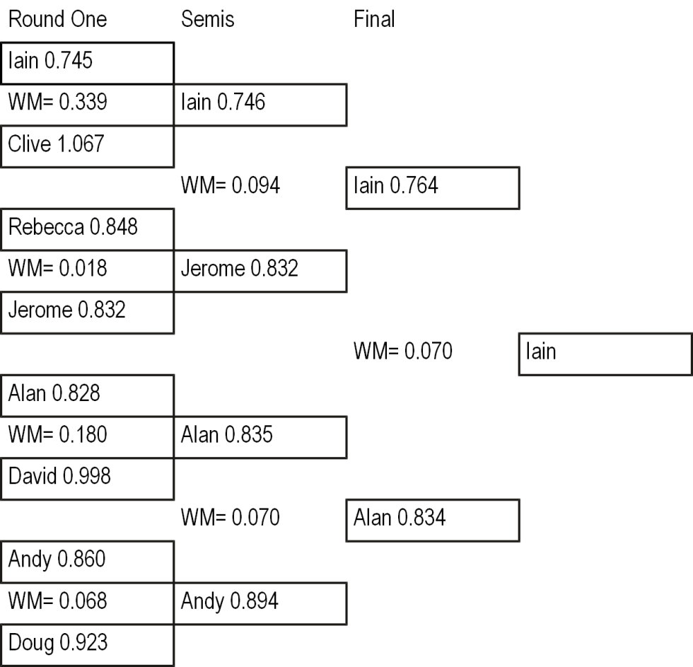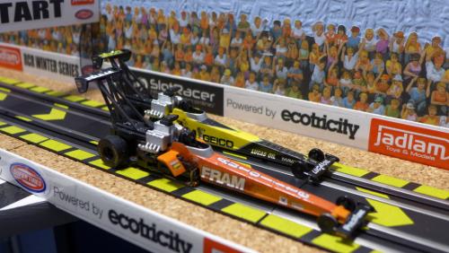 The first half of the first semi-final was extremely close, Jerome having a small lead at half distance. Then Iain's car found a big burst of speed to win by 0.094 seconds - his ET 0.746. It was a devastating turn of speed.
