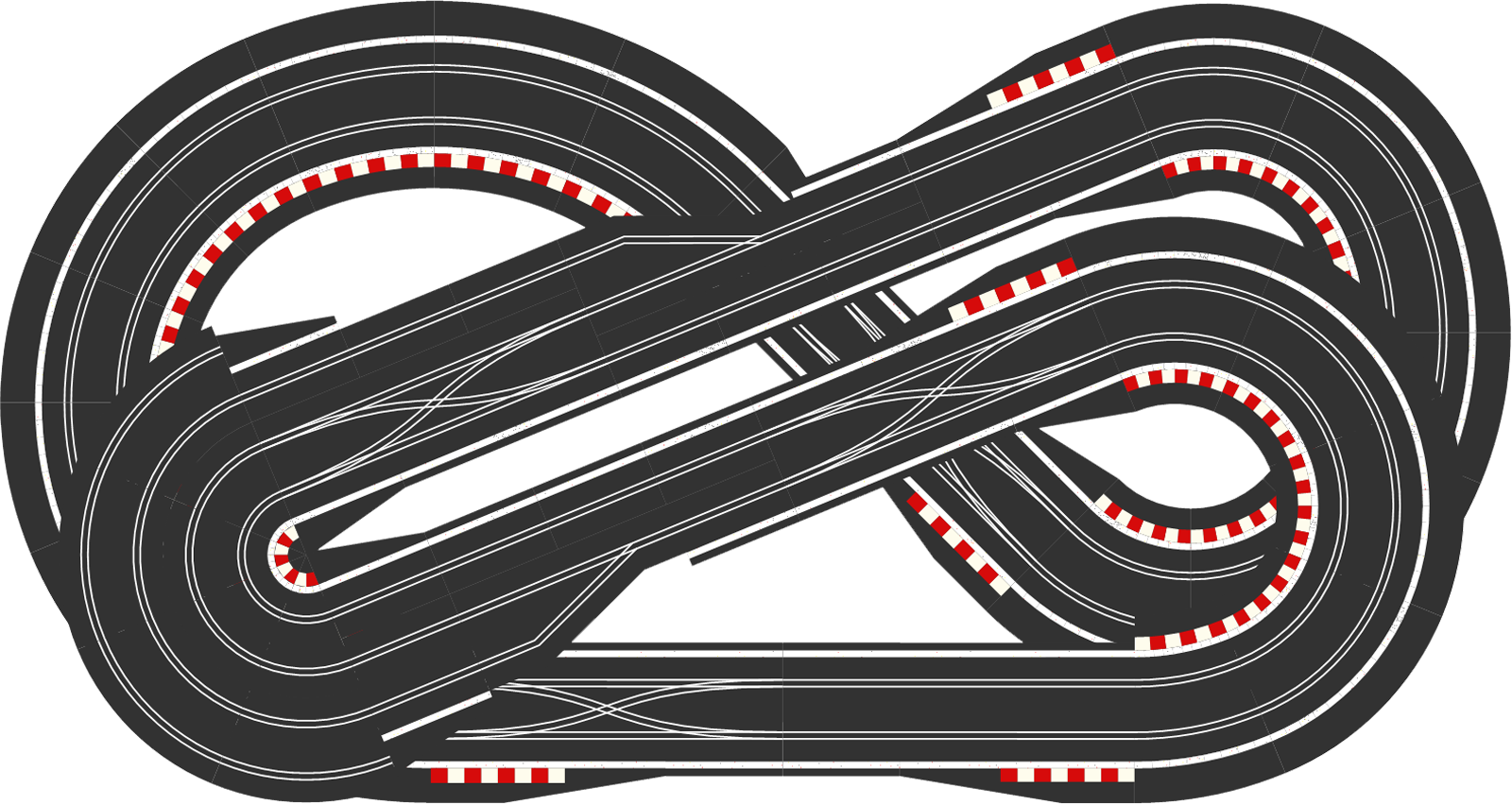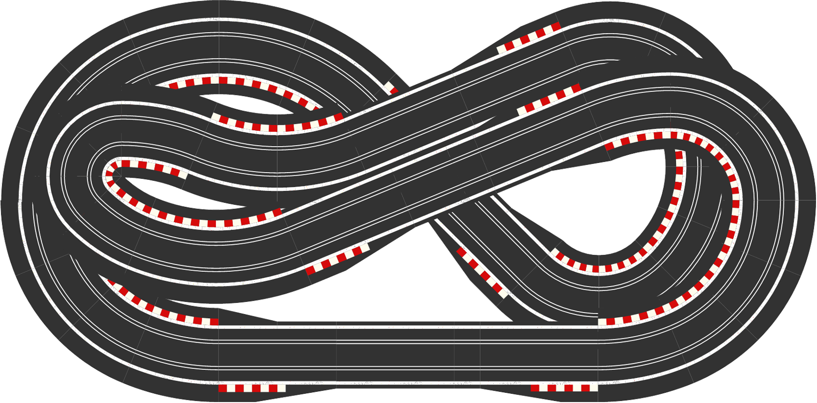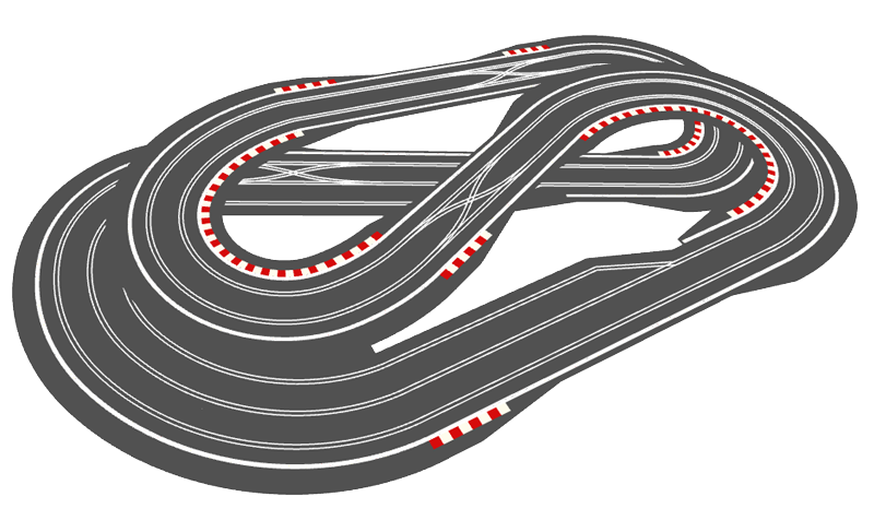 But looking at the tracks above, I just wonder whether something like SCX-5015 or SCX-5112 might make a better test track? They might not be as visually appealing, but they have a much more even balance of corners. You could replace the flat R3s on the left with banked R3s, which would give you a nice high speed section round the outside, and you could replace a couple of the R2s with an R2 crossover curve, so that you drive both lanes, and therefore test your cars on every radius of corner that Scalextric have to offer. Just a thought.