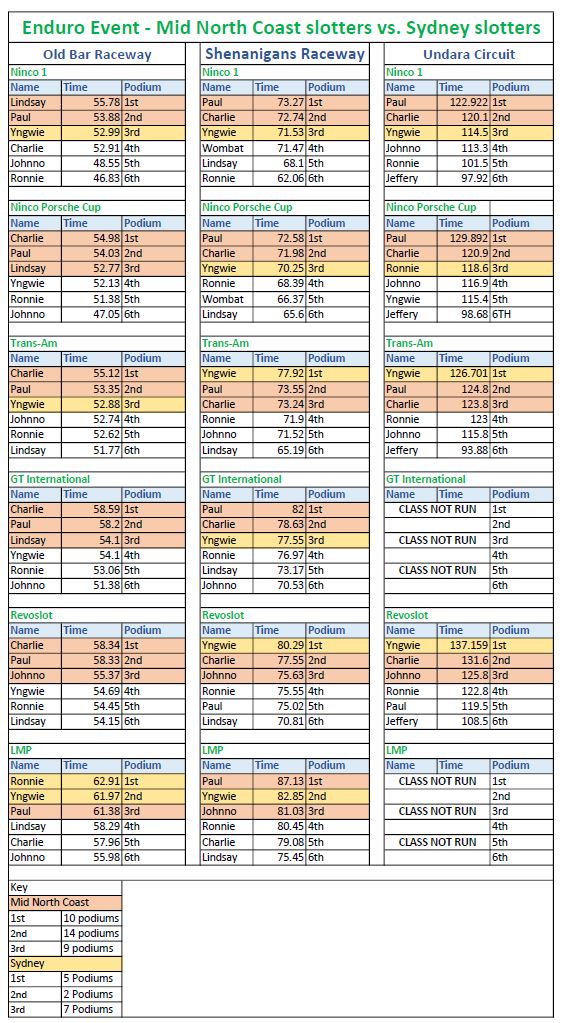 The spreadsheet I wanted to do to see who won and it is clear that the Mid North Coast slotters retained the Title for the second year running,, woohoo   Rofl looking through the times it was pretty well close all along the event, it feels great to take a few podium places myself against way better racers.