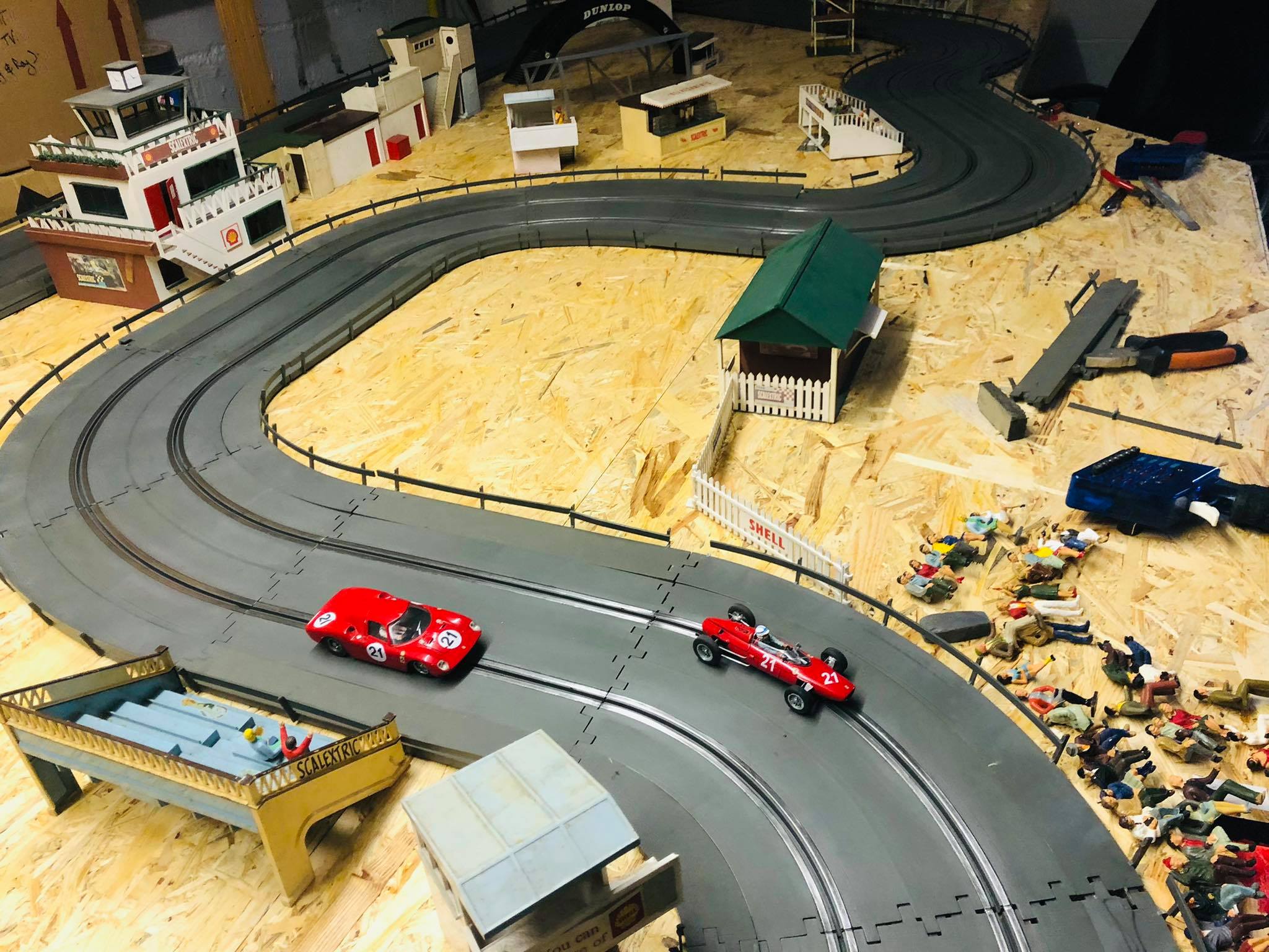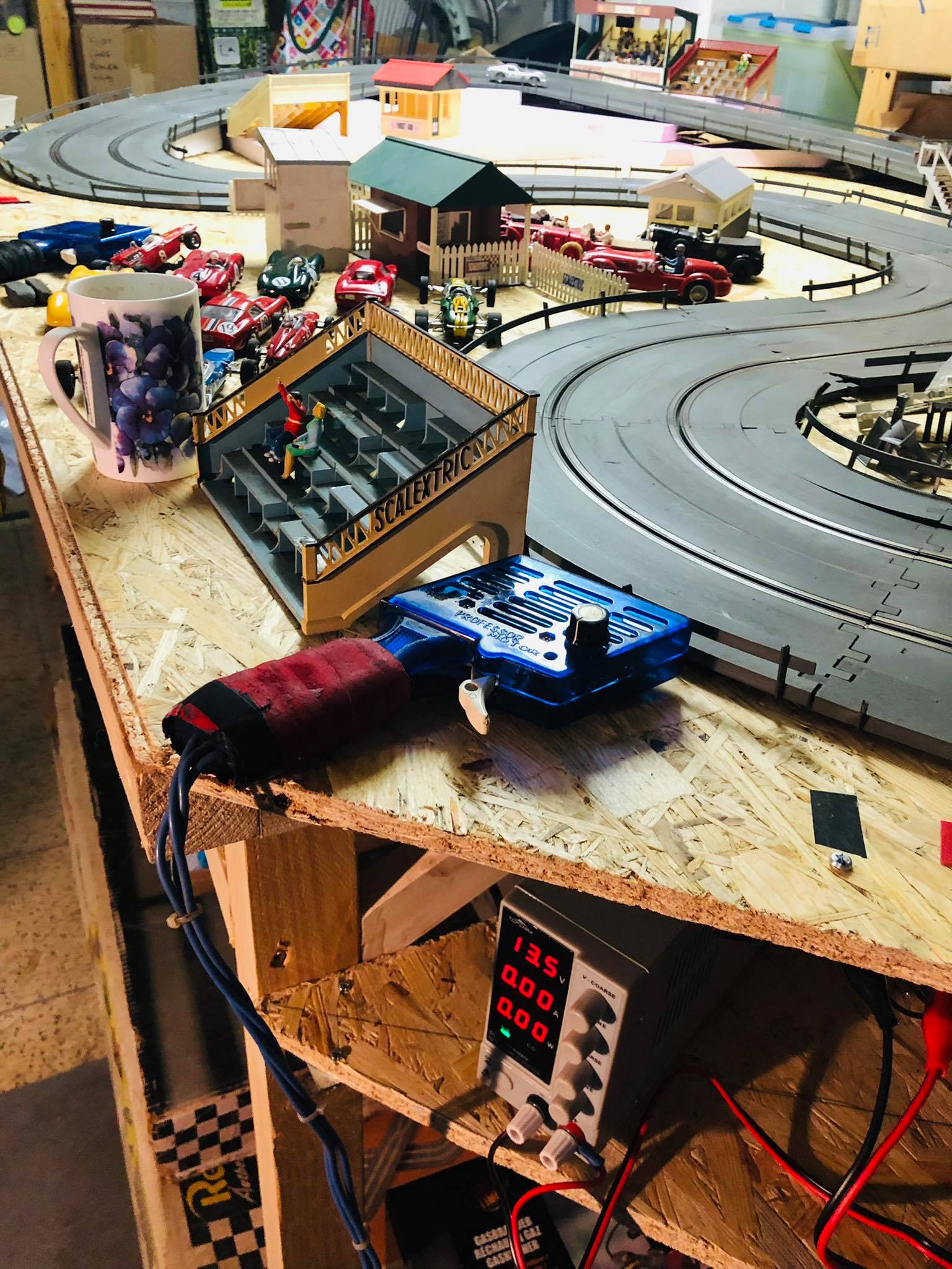 Have tacked down the track as well so it will not move . I need to move the table slightly to get to the other side of the main straight, so have bolted together the 2 seperate tables so will be able to move it when I have gotten rid of the clutter.