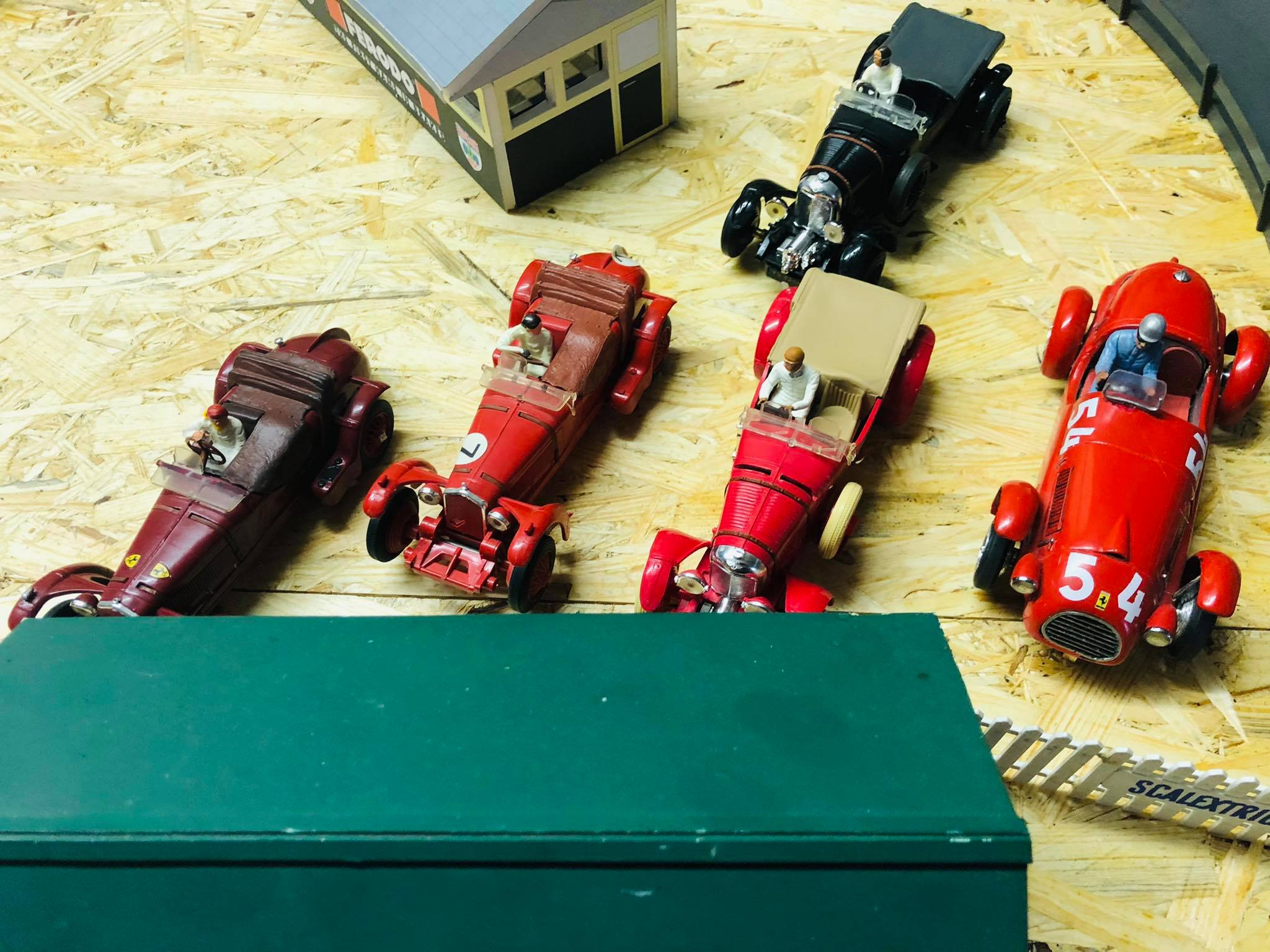 Man those old Bentleys are such a blast to drive. They are first issue tupe and hold the track well for their size. The Alfas are the re-release type and while they are faster in a strauight line , tio easily because of the more modern 1980's guides.