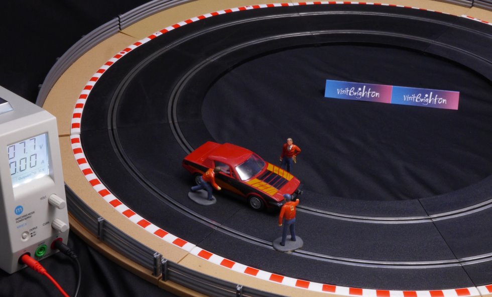 The skid pan is a circle of Scalextric Sport Radius2 curves, powered directly by an adjustable DC power supply. I increase the voltage until the car starts to stutter or slow due to a loss of traction. The car is run in both directions and I take a note of the voltage when the car starts to lose traction.