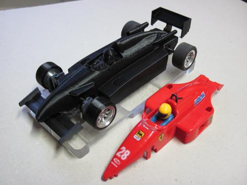 Been playing with TPU filament which for those not aware is a flexible rubber type filament which can be used for printing mobile phone holders and other flexible items, and with some patience front tyres (these at 95 hardness so ideal zero grip). Below is a 1/24 1980s generic F3 car alongside a SCX Ferrari 1/32 for scale that I have been working on since Christmas which incorporates the TPU front tyres and a TPU rear wing (virtually tear proof).