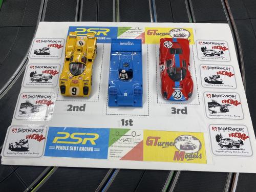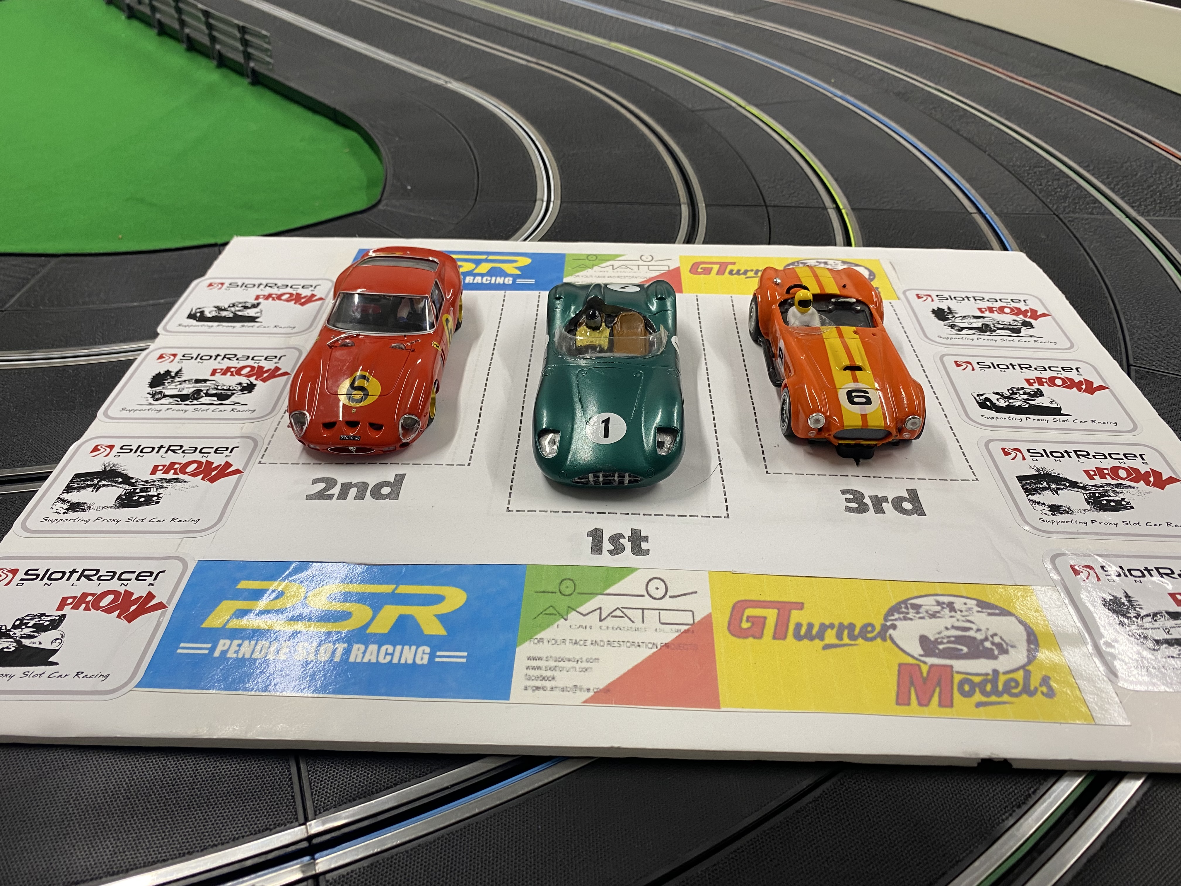 Very surprised but delighted to see the Aston Martin DBR1 of RoadRunners finally making top spot on this Round. But I suspect the rather late showing of the performance is not likely to threaten the overall result. The Ferrari 250GTO of Mountain View just missing out, but a respectable 2nd place and the AC Cobra of Bangers racing making 3rd.