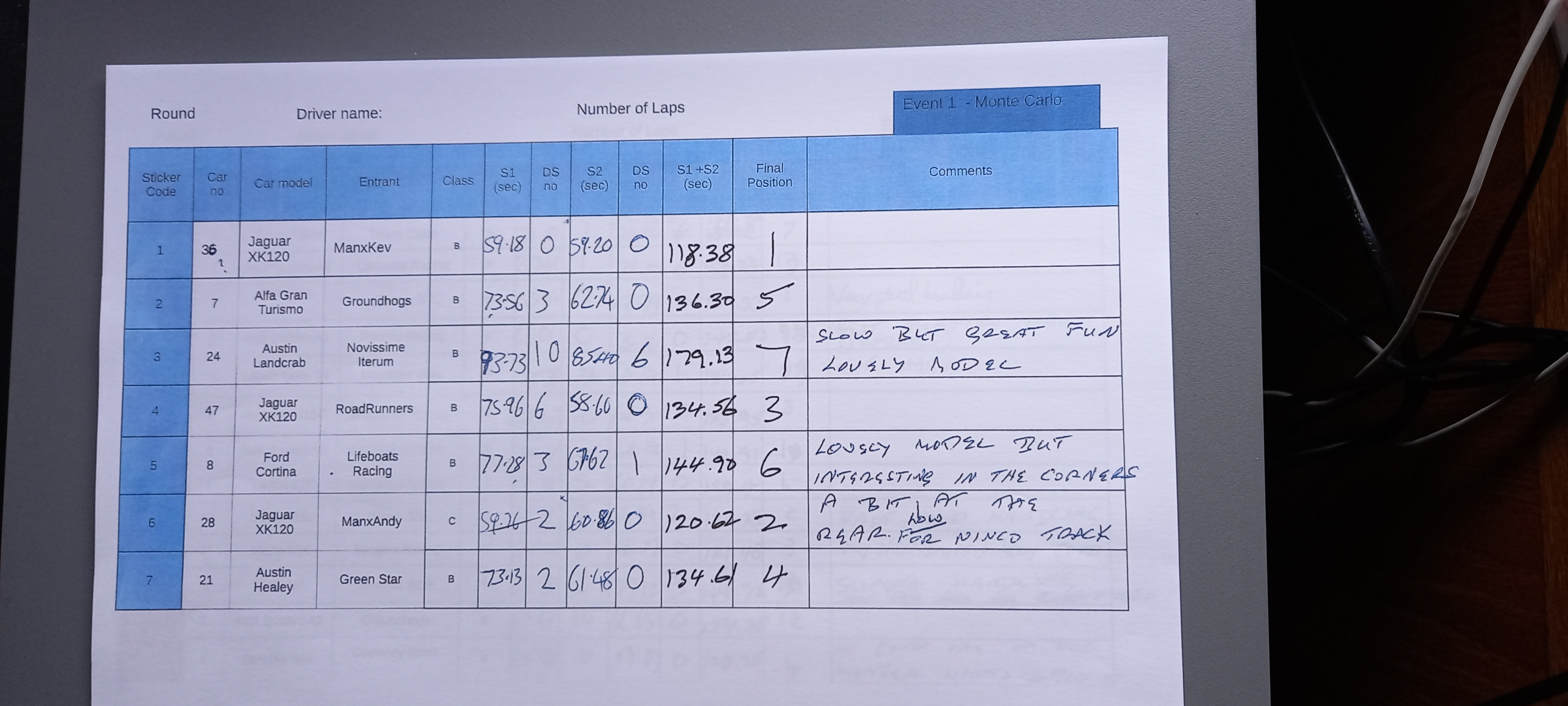 Well there are some gaps beginning to emerge, with Manx Andy's Jaguar breaking further ahead of his Club mates, and the RoadRunners Jaguar keeping up with Kevs car. Green Star Racing's Austin Healey more erratic behaving car had a great run on the Camel stage, it seems to have its moments but perhaps not enough consistency. At the back of the field there is close running between Lifeboats Racing -Ford Cortina and Novissime Iterum's Landcrab. And perhaps the Gran Turismo of Groundhogs can make an effort to gain some "Ground" in the next Rounds.