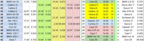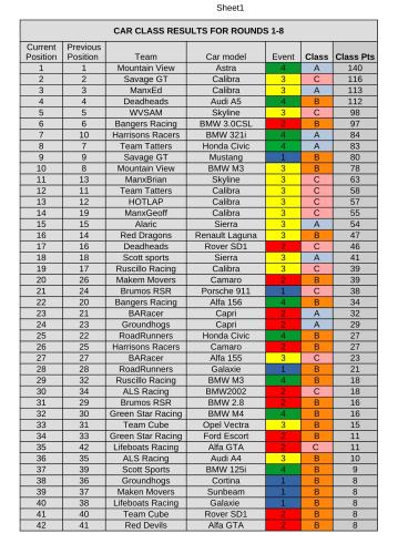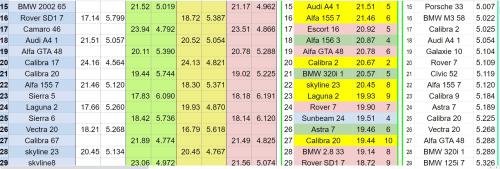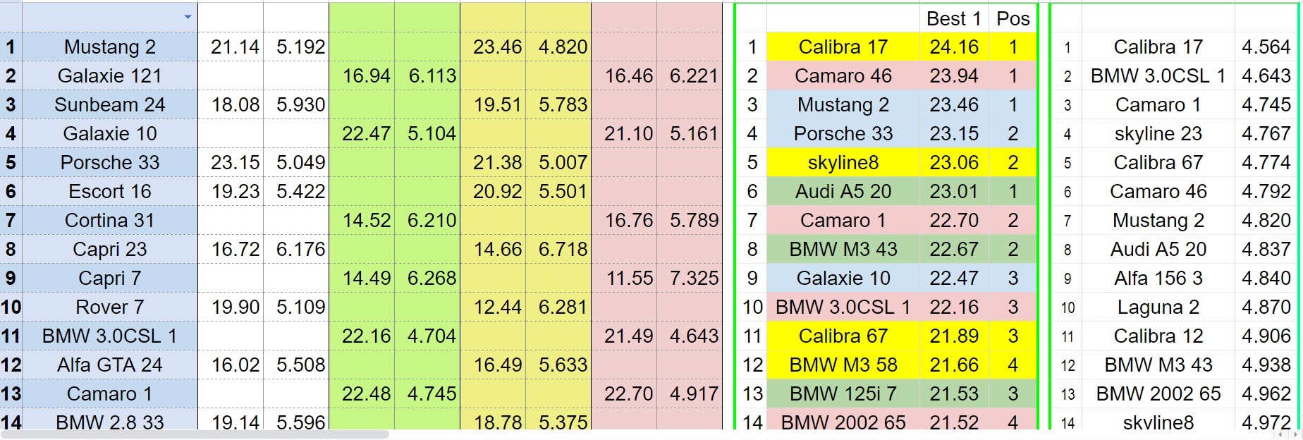 Here we have the results, order of running & pair of lap times on the left, then the far right column shows the cars in order of their fastest lap, the one remaining column, colour coded to the class shows the final results in order of best overall performance.