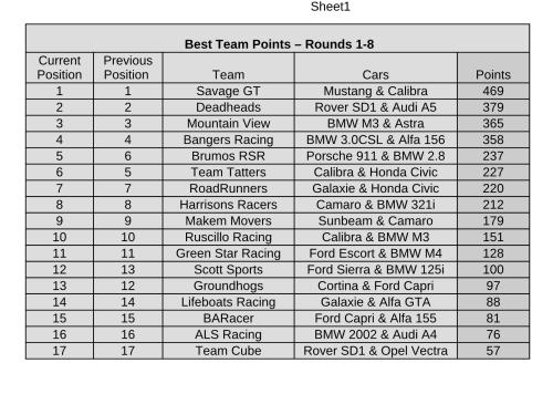 Bangers Racing BMW loosing ground to Deadheads Audi, Savage GT just managing to get the Mustang into 3rd Place at the expense of Mountain Views BMW M3 by 2pts but the pack of runners up is very close behind.