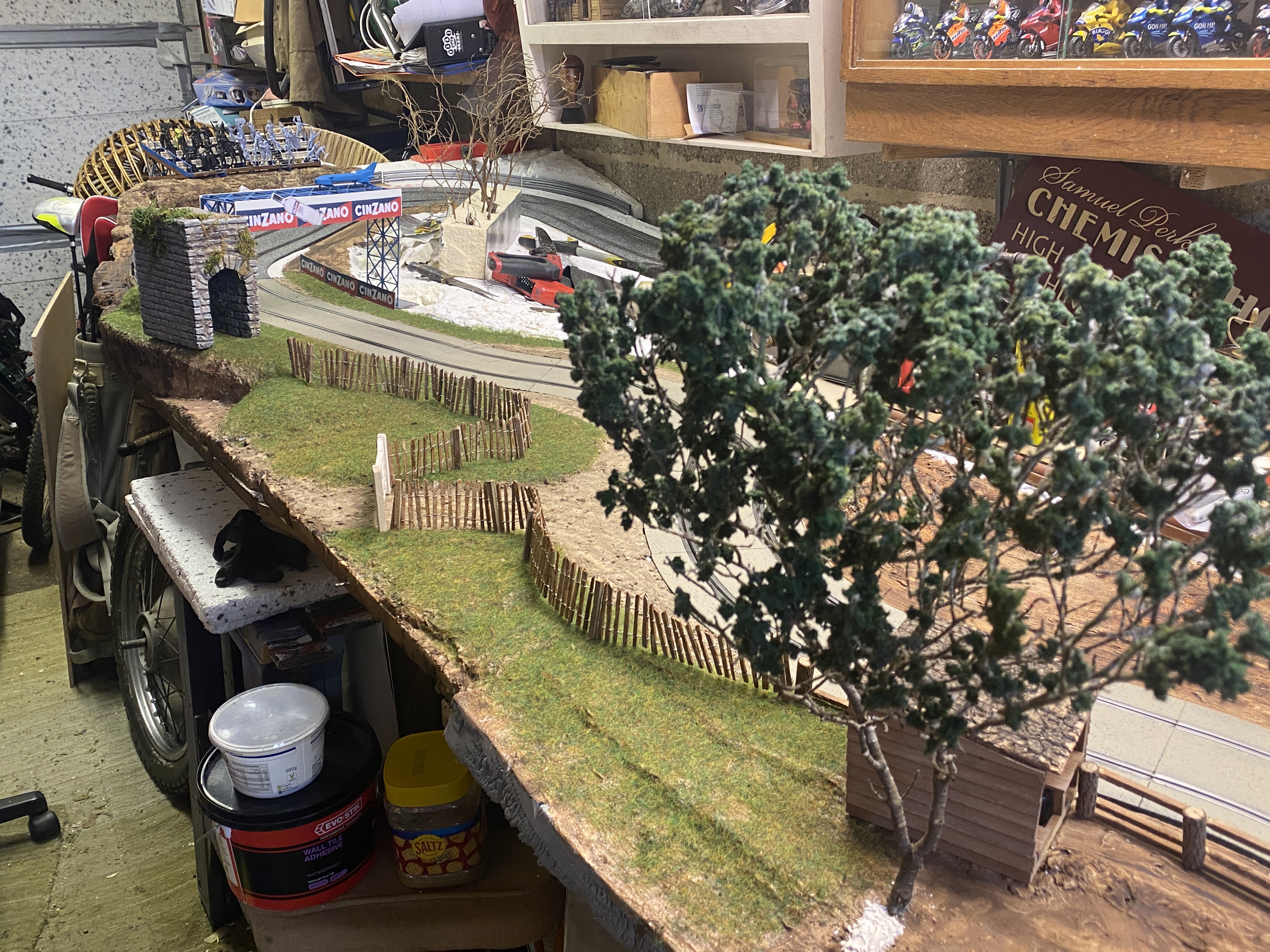 Last Autumn I collected a load of branches to make trees and here's my first one. This will have the start finish banner attached to it and a pole over to the infield.