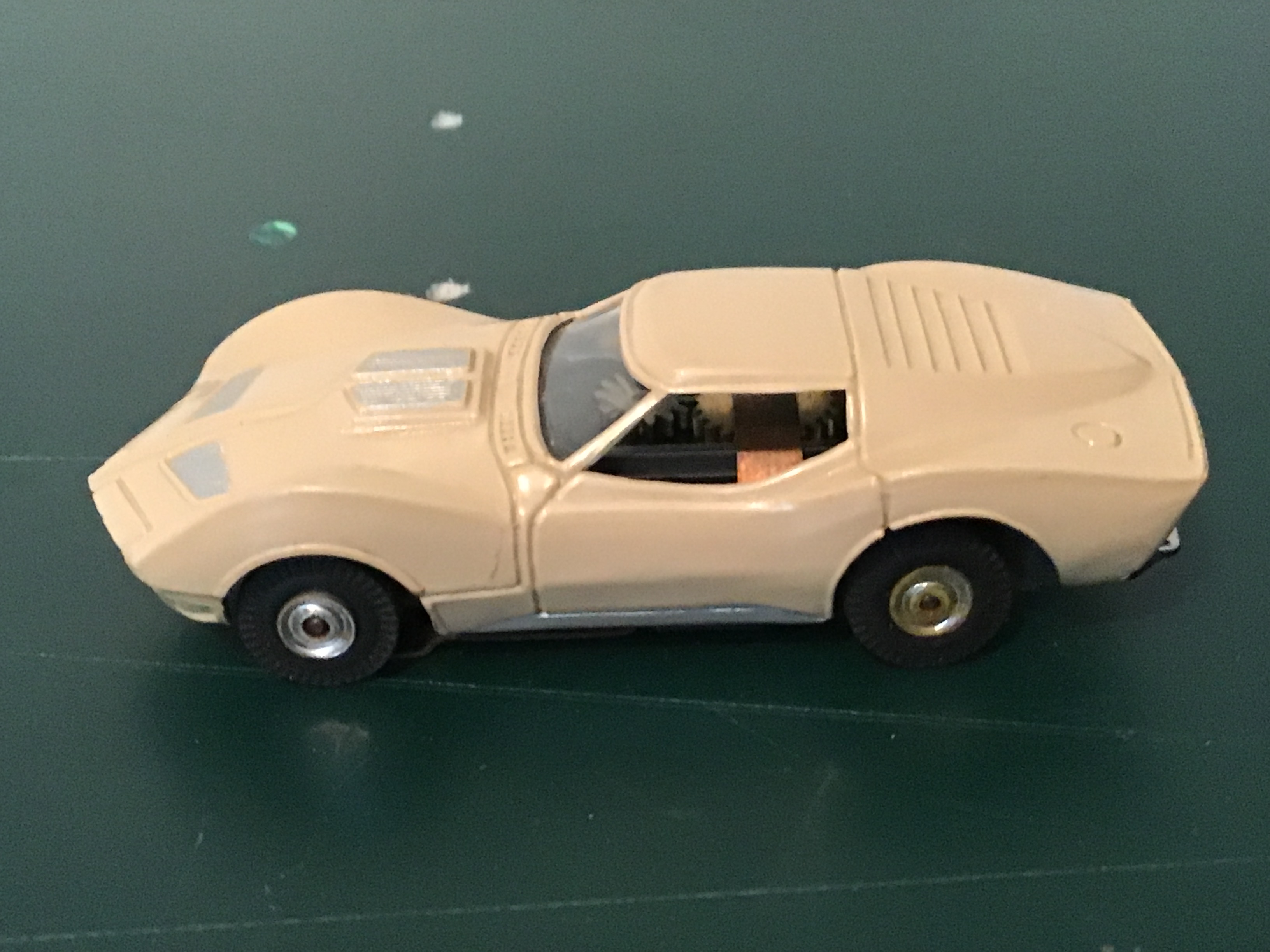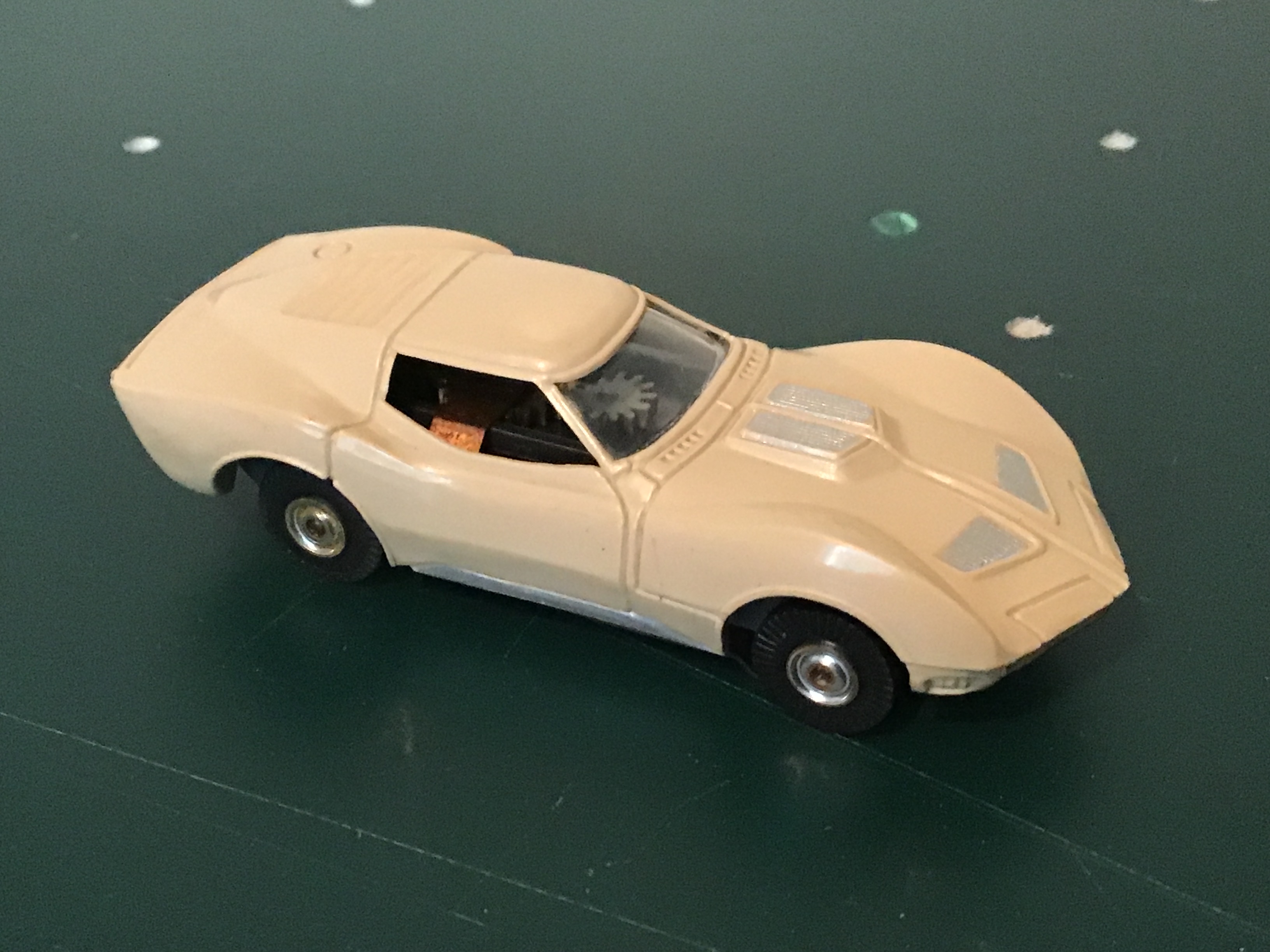 I have just received an Aurora t-jet Mako Shark in mint condition. It is in beige and the body is unmarked. I have been looking for one of these for a long time. It is on an original open rivet chassis.