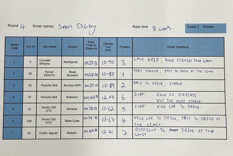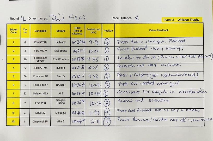 Another strong run for the RoadRunners Ferrari 330 Spyder. Sam D Chaparral 2E came alive on the home based track. Bangers racing Ford P68 struggled to keep up with the pace. Overall looking good for the RoadRunners at the moment, ModSports & LeManx fighting for 2nd & 3rd.