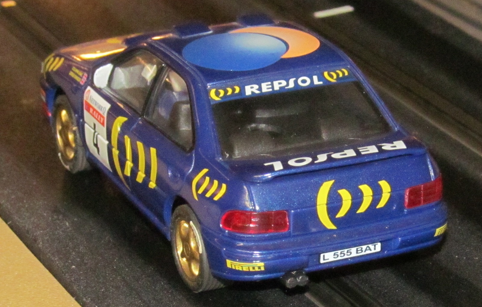 SCX 64830 Sierra Cosworth. This one had been well used. The aerial is loose in the roof (taped, as per pictures), both mirrors have been glued on, the paint on the wing is crazed - although the wing is intact. The headlights blew quite soon after I bought the car, and have been replaced with 2x individual LEDs soldered to the original copper contacts. The tyres are homemade 40a urethane slicks, but one pair of originals are included.