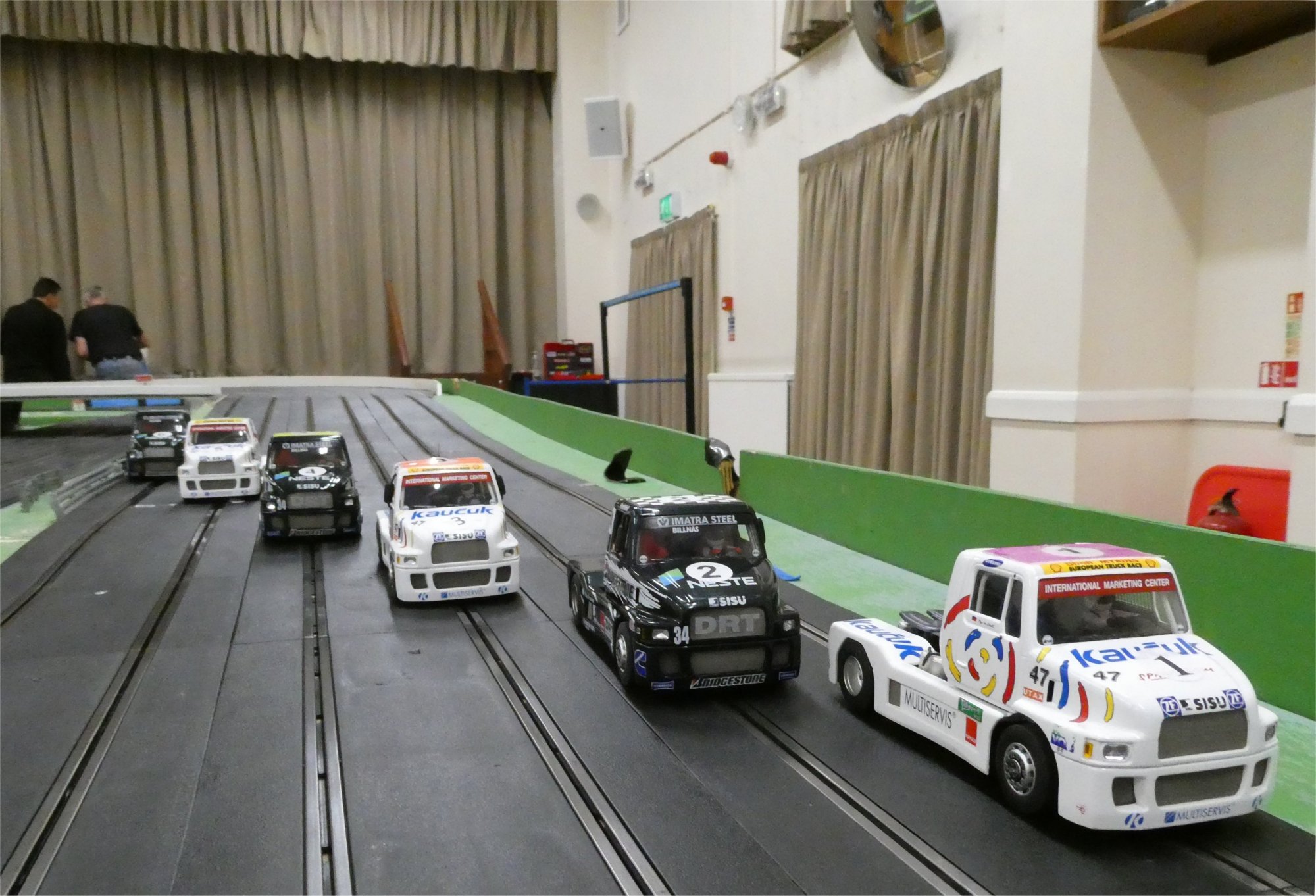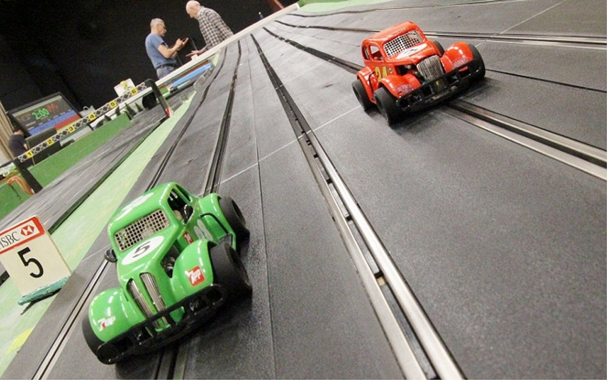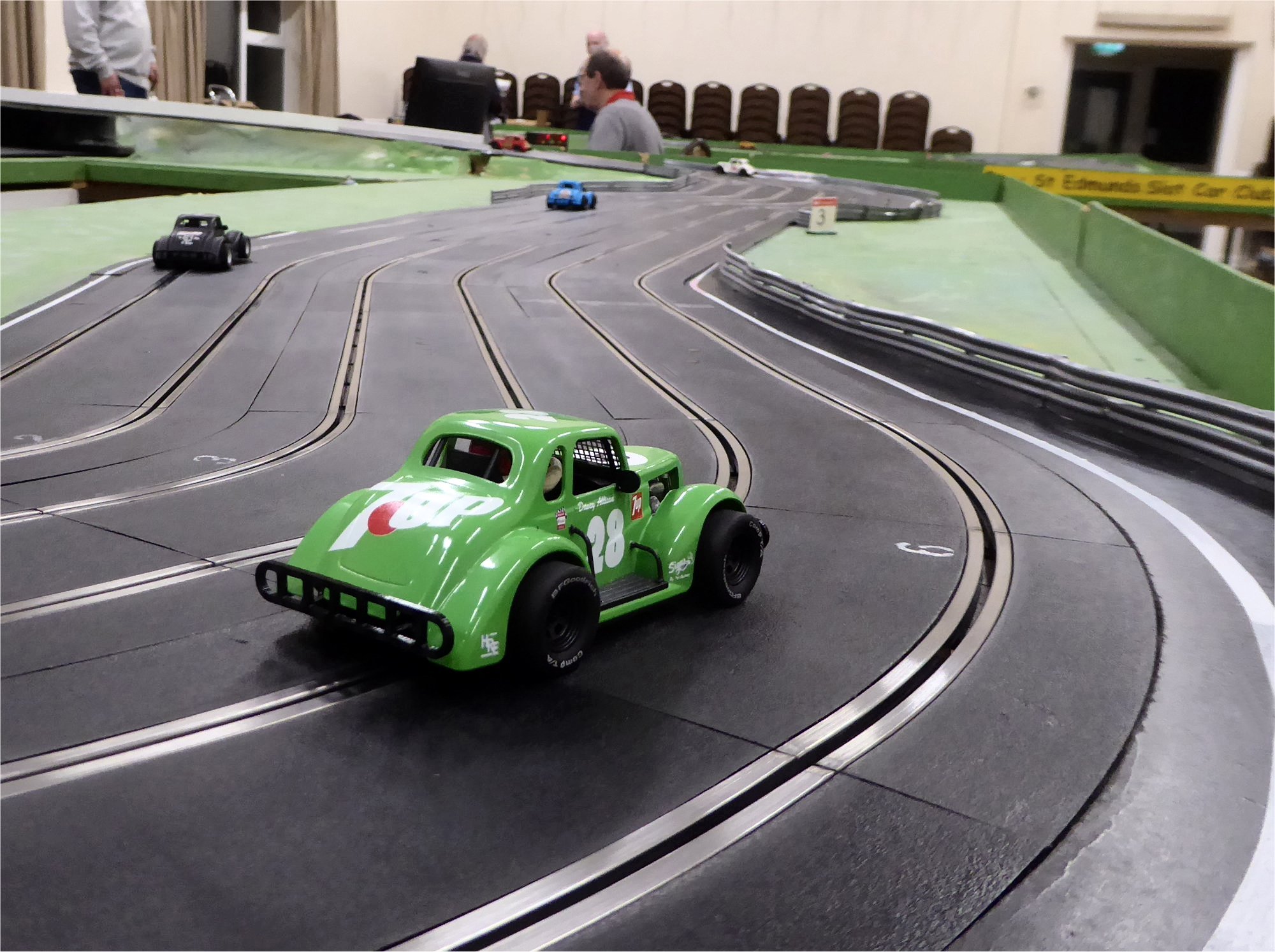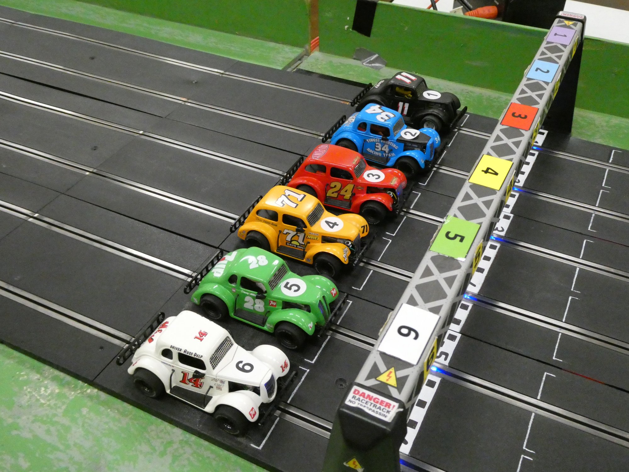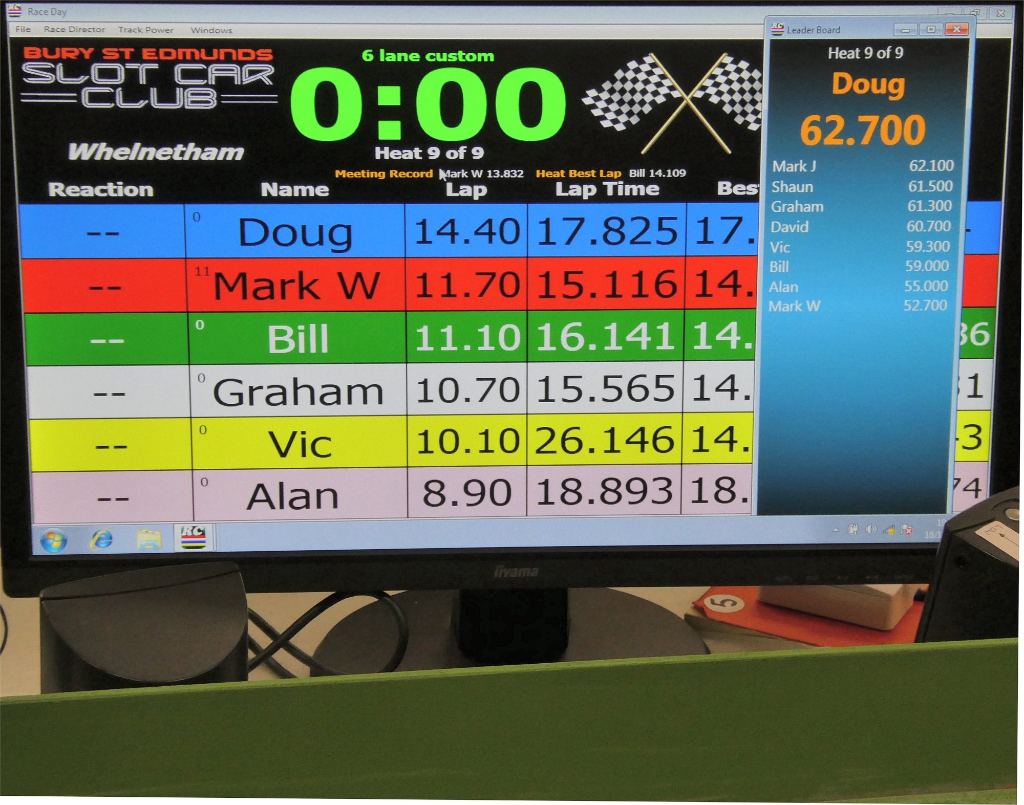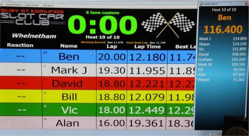 With equal cars it was down to the car set up and smooth driving from the eight drivers. Close racing ensued with many side by side battles, Vic eventually coming home in first place just seven feet ahead of Bill. The screen shot from the last heat shows how close the racing was, Alan taking the win by a fifth of a lap from Ben, with Mark J just over a half a second behind in third spot.