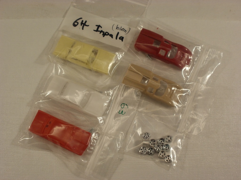 More bodies and Vincent wheels came in from Mike Vitale of MEV Originals. The Lola T70's are both exceptional. The red 66 Corvair, and white 63 Impala are for someone else on this forum to repay a favour. The beige 64 Impala with the blem got thrown into the box as a surprise. I can easily fix it! Thanks a million, Mike!