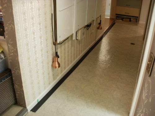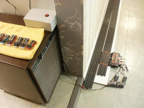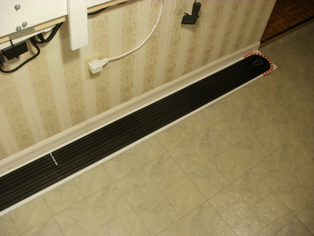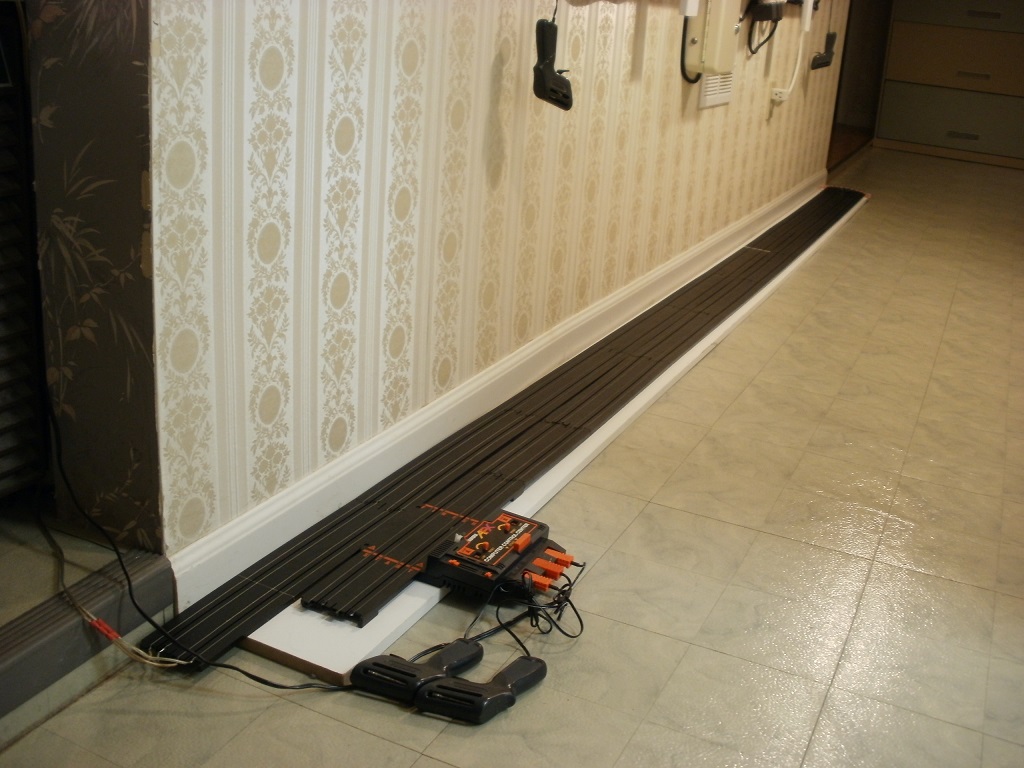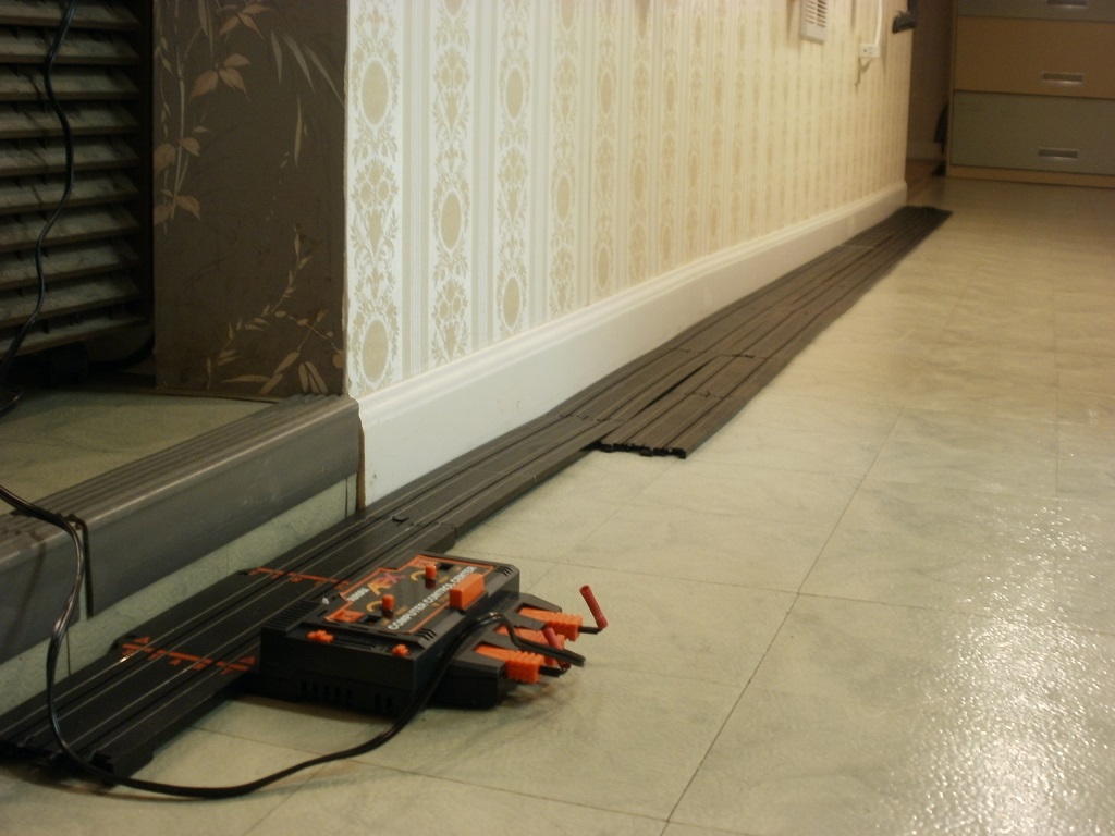 Drag race test track version 1A. Just the basics. The shut down area was very long because I had no idea how much was needed without a pillow. No power yet. The green tape on the wall beside the track marks the 7-foot run.