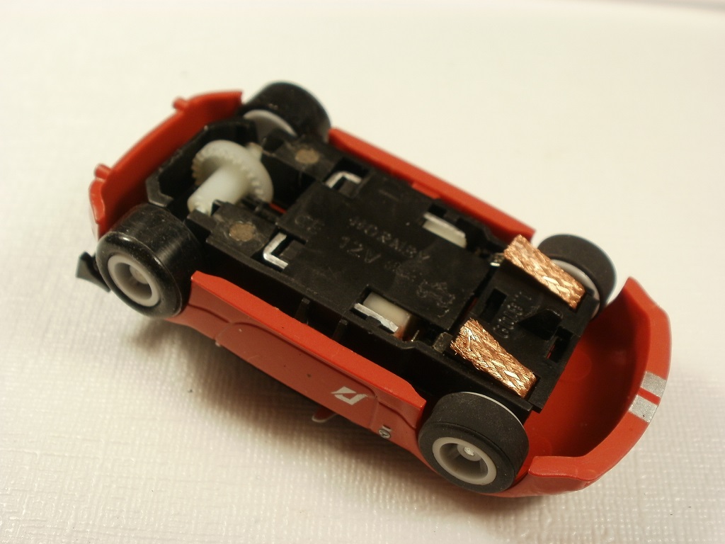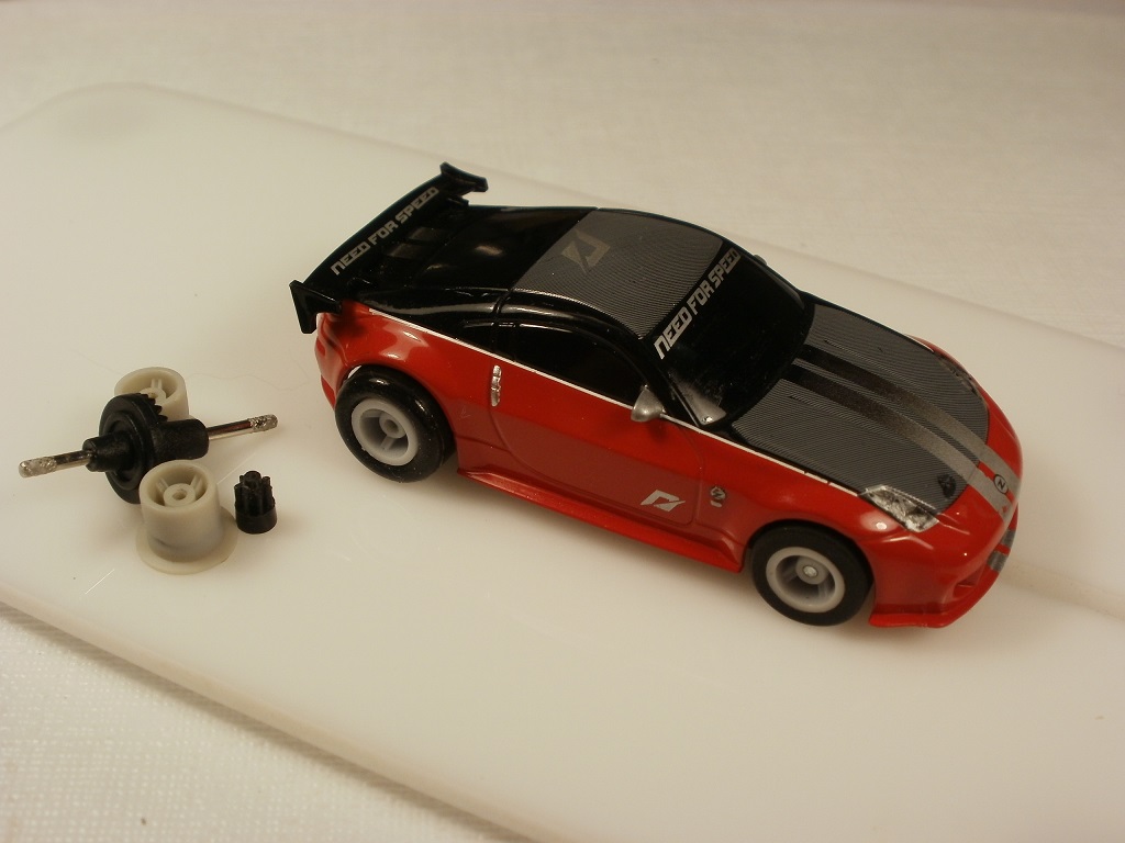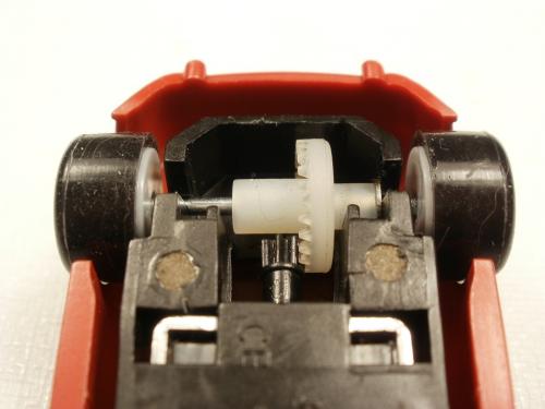I nearly killed/melted the poor little plastic chassis trying to change the motor. The metal braid supports inside the chassis got deformed from the heat. I ended up breaking the original braid holder/guide. Luckily I had a spare. I bent the braid supports back in place... sort of. Part of the tab on the motor broke off. I was not having a good day. Then I found the rear axle was defective/bent hidden inside the crown. That was a new one for me. I was ready to give up. Fortunately the care package from a generous doner had one more axle that was smooth. The pinion was changed. An axle spacer was added to set the gear mesh. The front tires were trued.