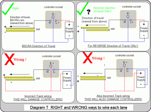 The positive wire from the red banana plug at the power supply, runs through the fuse and to the L terminal and then to the positive rail on the track via the N terminal – the power has gone through the controller from L to N. Do check for the N and L on the terminals. The BSCRA diagram shows the three-pin plate from the top down – we wire it from the bottom.