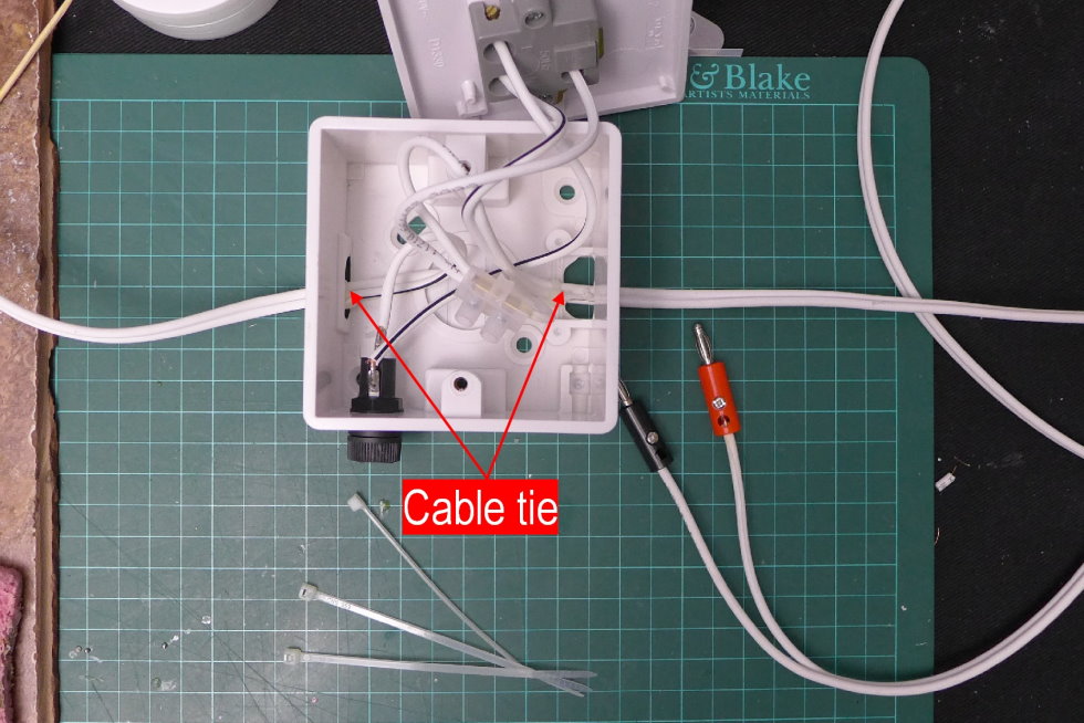 Now the banana plugs are attached (hopefully to the correct wires...), I have added a small cable tie to the cables going in and out of the box to prevent them being pulled from their connections in the box. I’ve pulled the cable ties nice and tight, so if I pull the cable, the tie catches on the inside of the hole in the box wall and prevents the cable being pulled any further…