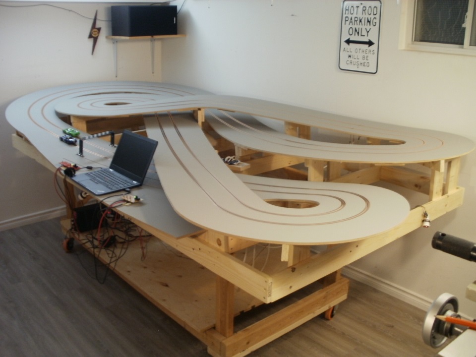 My friend came over and gave the track the copper-tape treatment today. All the wires and timing system were also added and set up. It runs great.