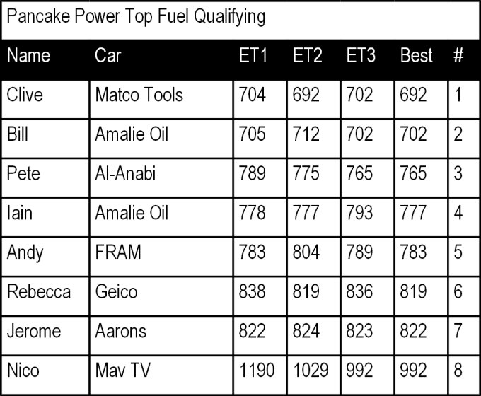 I'll be running the T-Jets and Top Fuelers this evening - and they have just qualified...