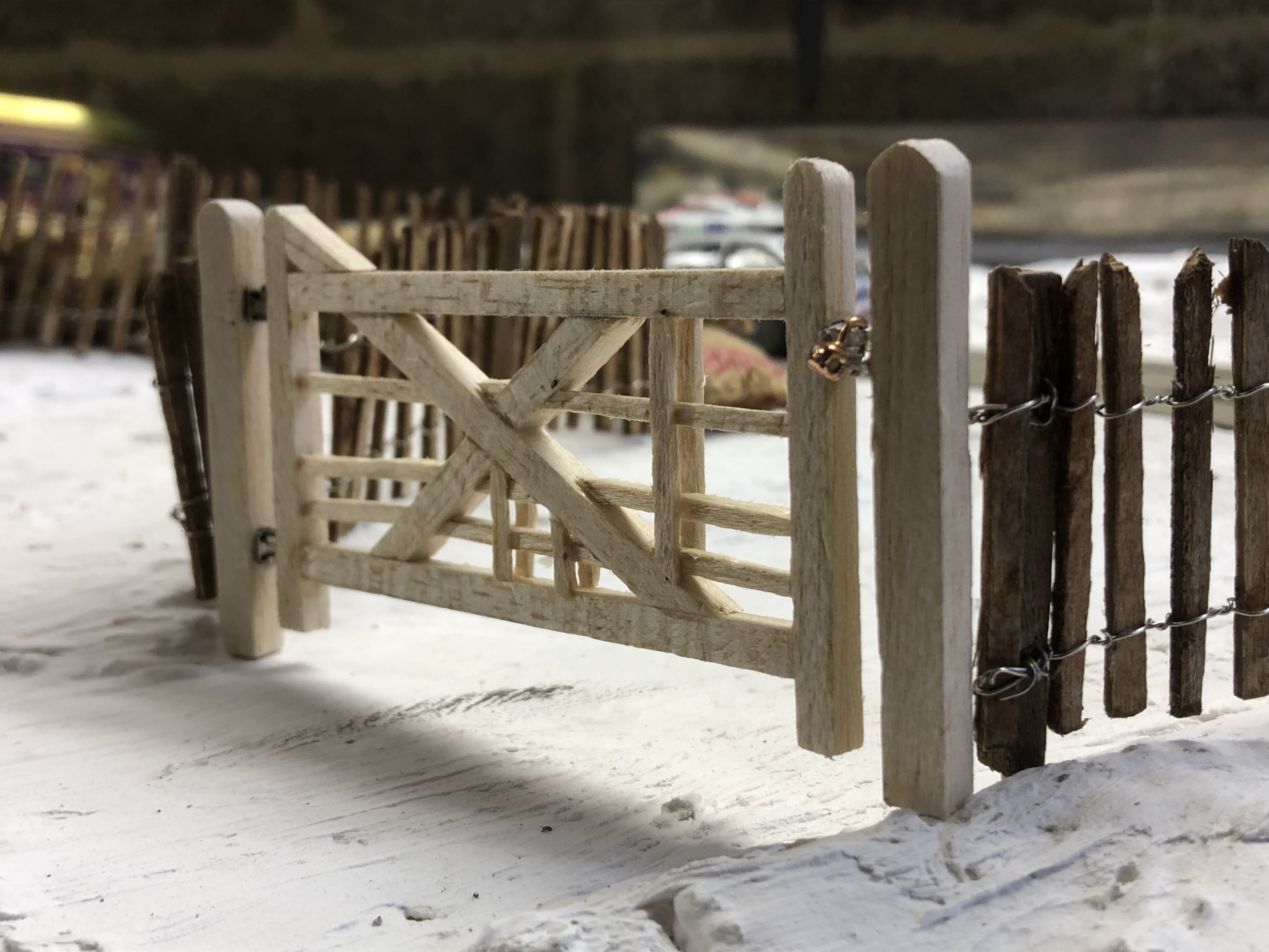 I made a wash and stained all the pieces then used thin wire to put the femnce togeather.