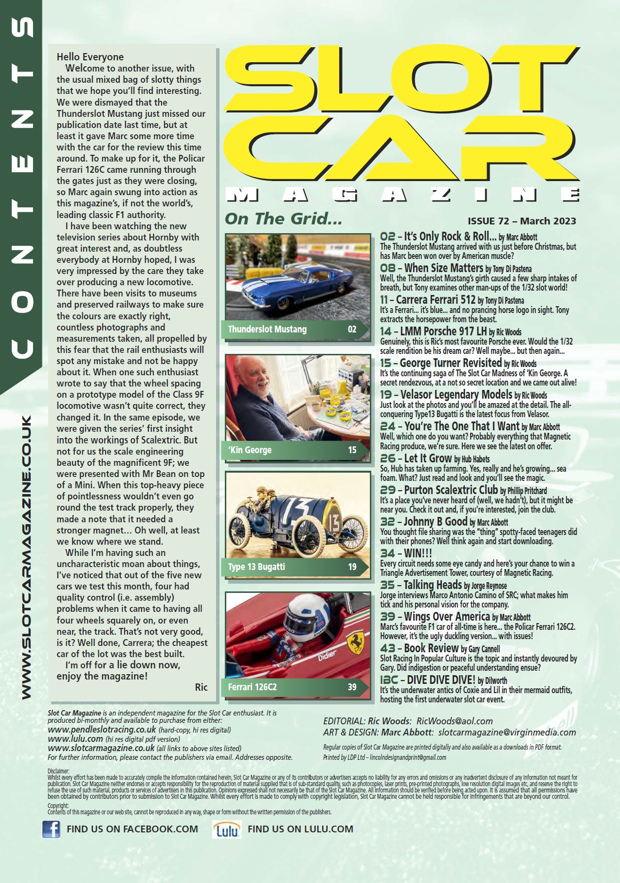 Now available the PDF version of issue 72, March 2023 of the stunning Slot Car Magazine International by Ric Woods and Marc Abbott from Lulu,