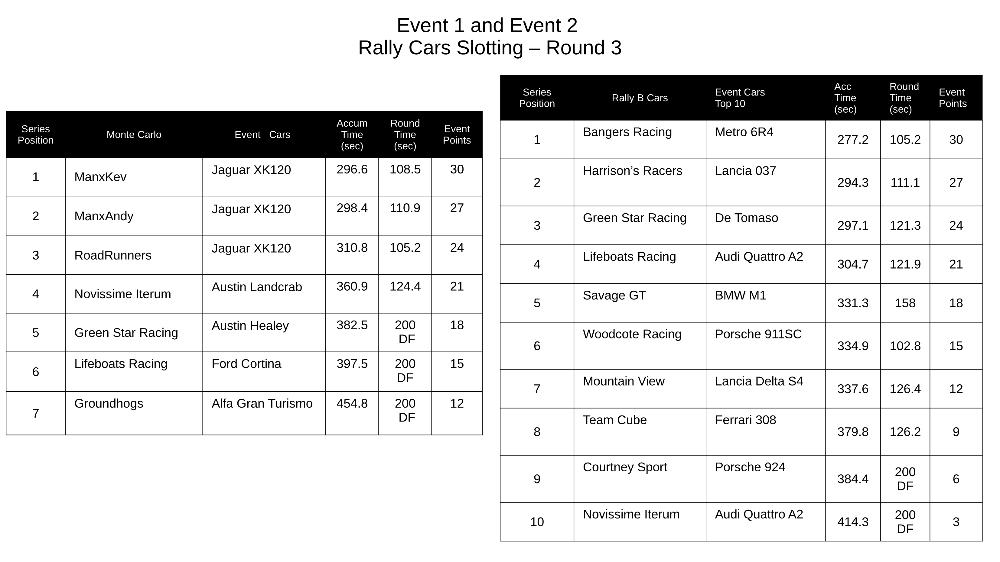 So I have applied a 200 sec time DNF Default time across the 3 Events (based on the average time + 1minute), which also means that a couple of cars which eventually made it round but took an excessive time do benefit a little from this, as well as giving the DNF cars the chance of a recovery within the overall competition time frame.