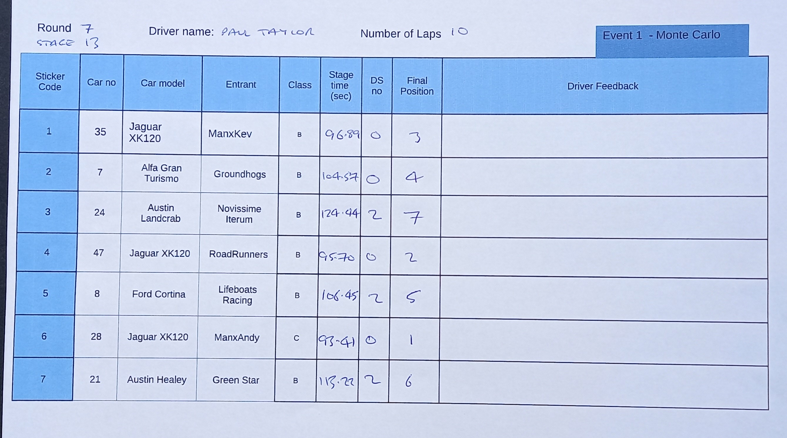 There are also timing issues with the Event 3 cars which have been raised relating to the videos which Paul has posted to date, but we will need to see all the videos in this Event before we can correct these results.