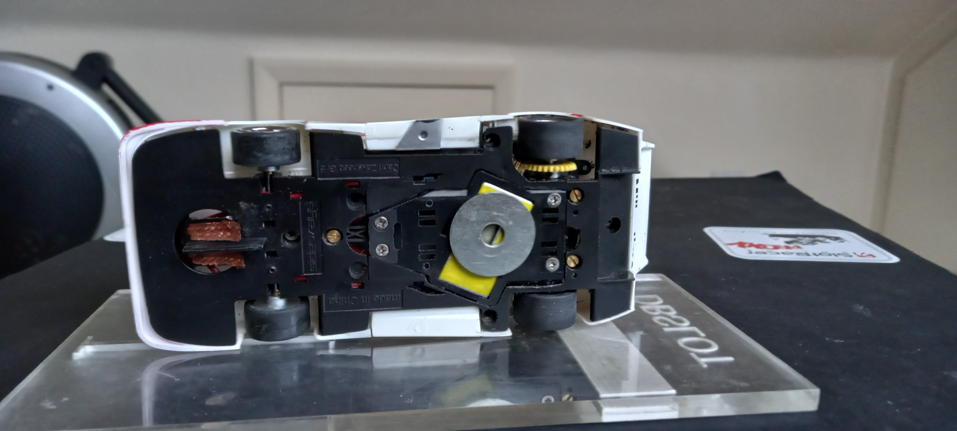 I have adopted a standardised metal disc or "washer" to place under the car between the front and rear wheels on a set up plate.