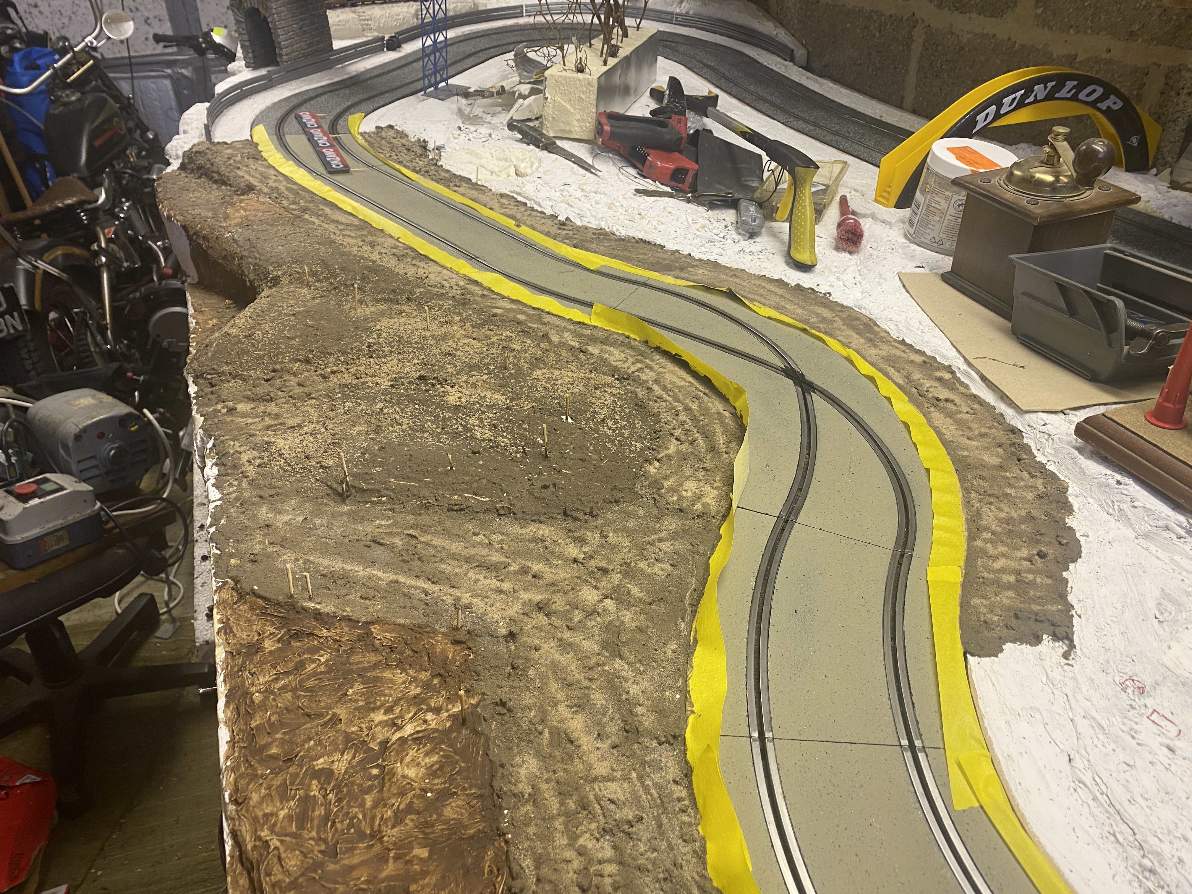 I painted a brown wash down and then mixed up some dirt/sand/plaster and water and pva to a consistency I could spread easy enough but not too runny.