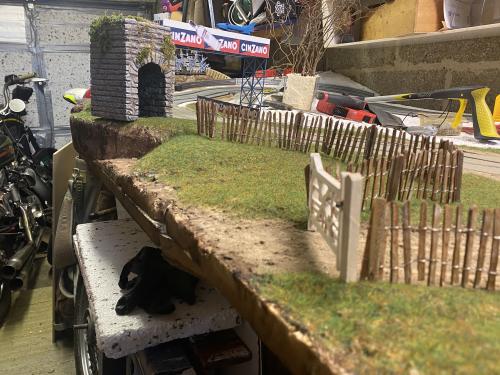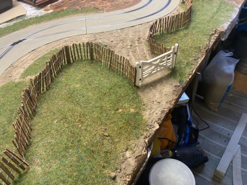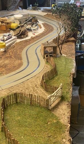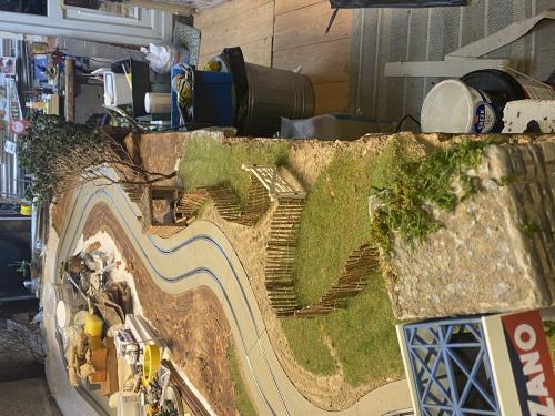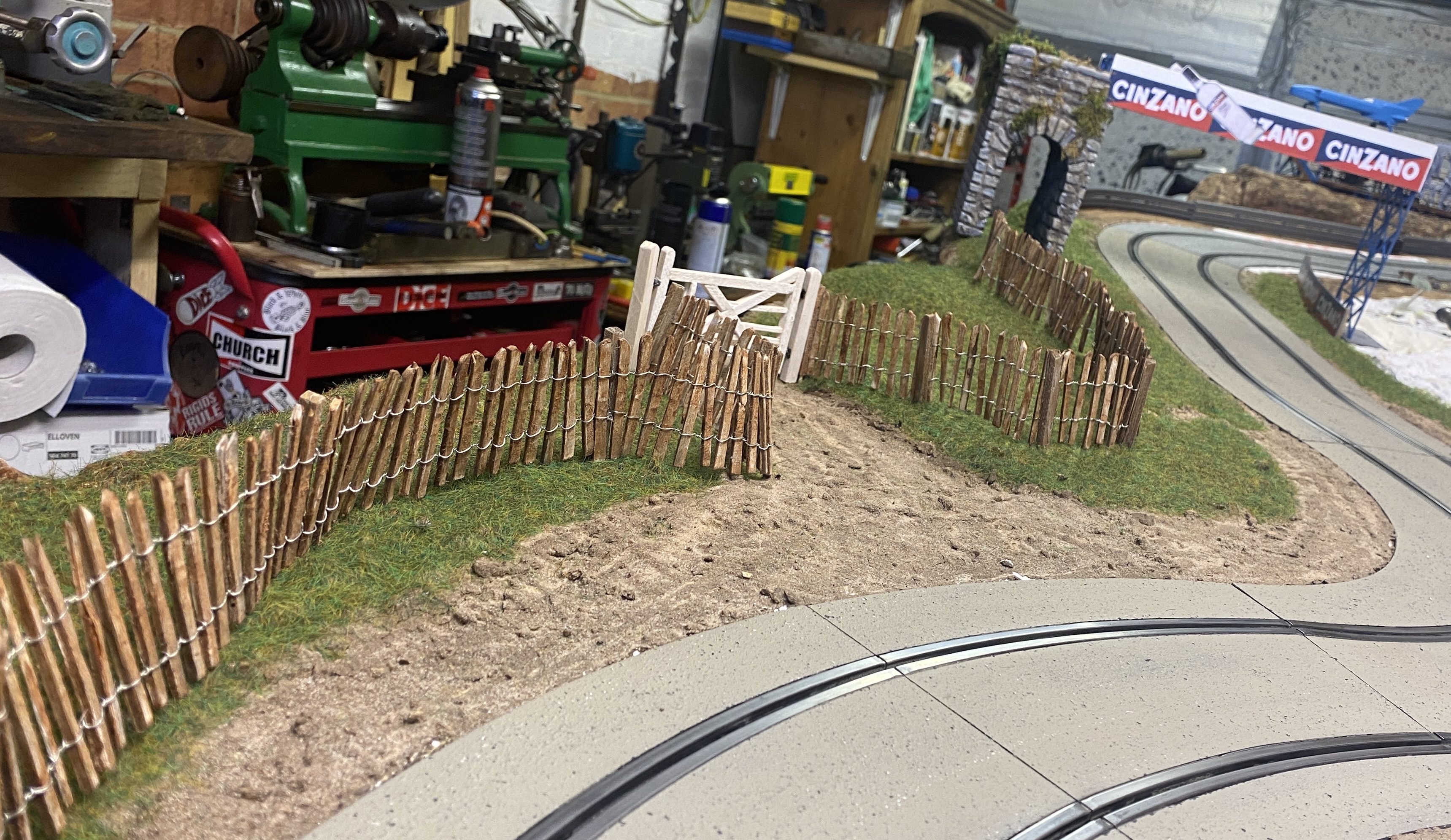 Last Autumn I collected a load of branches to make trees and here's my first one. This will have the start finish banner attached to it and a pole over to the infield.