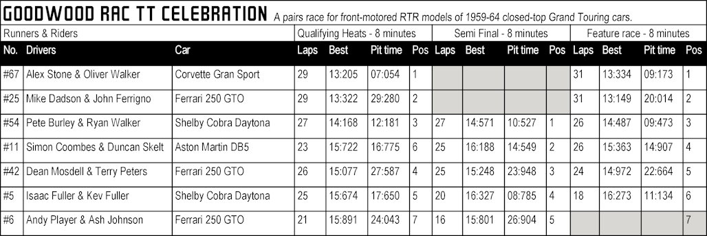 Heat Two had Andy & Ash in the red Fly Ferrari GTO, Mike & John in a similar silver GTO and Pete & Ryan in the #54 Cobra Daytona. The red Ferrari struggled, leaving a great fight at the front - the silver GTO eventually prevailing, despite far more time in the pits. Mike & John's score of 29 laps put them equal with Alex & Oliver, but the Corvette would start from pole for the Feature race thanks to a best fastest lap by just a tenth of a second...