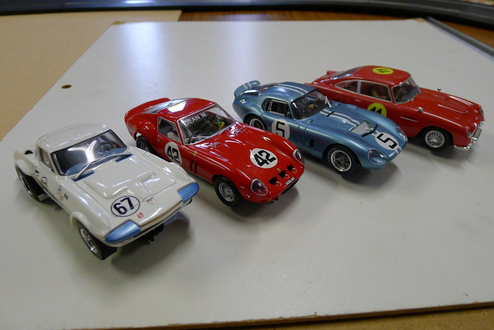 The Corvette and the silver GTO lined up on the first row of the grid - but would that extra eight minutes of racing bring the chasing bunch into the equation? Dean was playing catch-up from the start, the Scalextric Ferrari slow off the line. John and Oliver had a right scrap during the first part of the race - the Ferrari having the slightly better pace, but needing to stop mid-stint for fuel. Coming into the driver change, John's Ferrari had the slimmest of leads over Oliver in the Corvette, Ryan was a lap behind in the first Cobra Daytona, followed by Simon, Dean and Isaac...