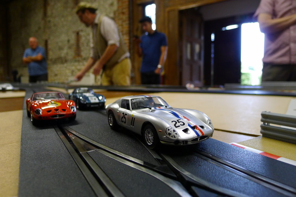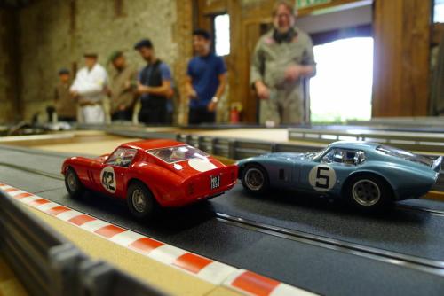 First, the other five pairs would battle it out for the remaining four spots in the feature race. The semi-final went pretty much to form, but gave everyone a little more track time to get them closer to the top two. Pete & Ryan always had the race in their hands - nice and quick and using the Revell motor's frugality to make just one stop. The battle for second was close - Simon & Duncan improving on their heat score to bring the DB5 home just ahead of Dean & Terry's Scalextric Ferrari. The most intense scrap was for the final qualifying place - and both pairs had issues. The rather slow Ferrari of Andy & Ash got the jump on Isaac & Kevin's Cobra Daytona when the latter needed a braid repair. However, an issue with the pit menu meant the Ferrari's three pit stops took an age. It was the Cobra that would go to the Feature race.