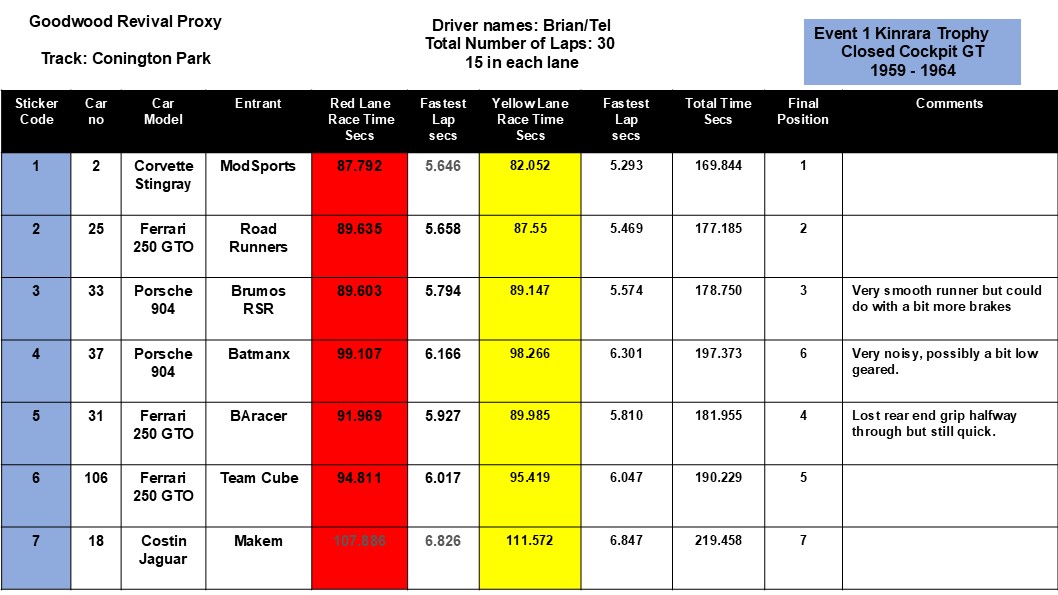For this round we ran each car on both lanes for 15 laps, I drove on red lane and Tel on yellow. The two times were then added together for the final score. There were no real problems with any of the cars, one stopped running after a couple of laps but that just needed the braids tweaking a bit and the heat restarted. There were a small number of minor off track excursions (5 in total) but none of them affected the overall results.