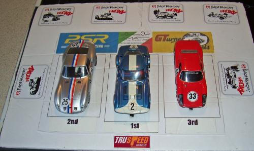 ModSports Corvette well ahead of the chasing pack. Road Runners 250GTO had a good run to 2nd and just pipped Brumos Porsche to 3rd place. The Porsche was delightfully smooth but we felt it was a bit lacking in the brakes department.