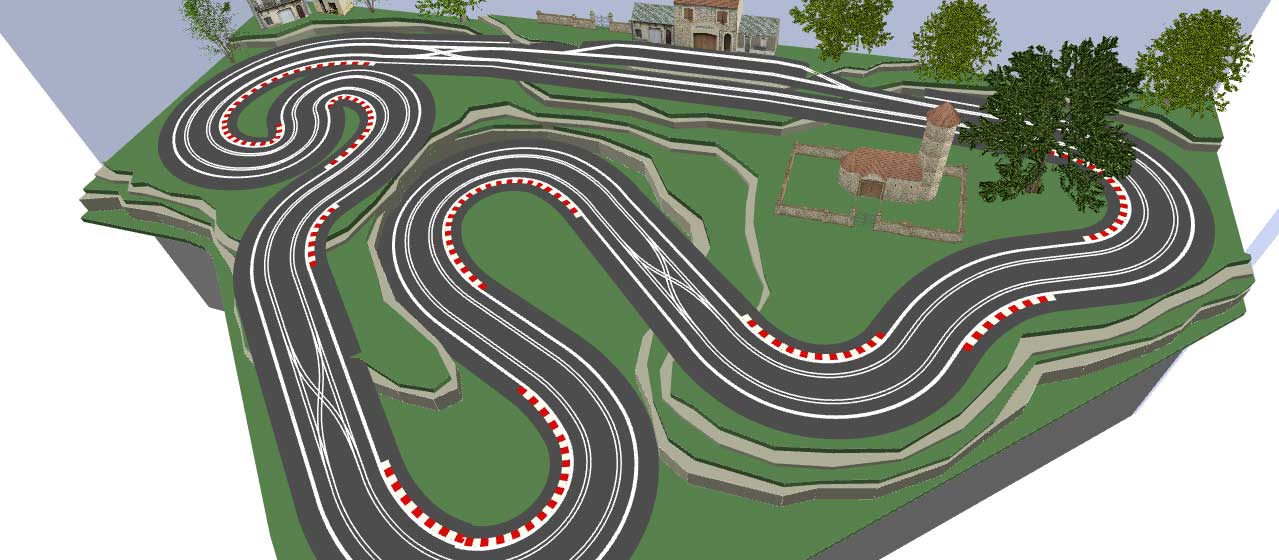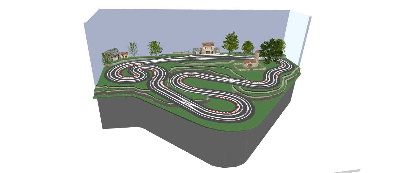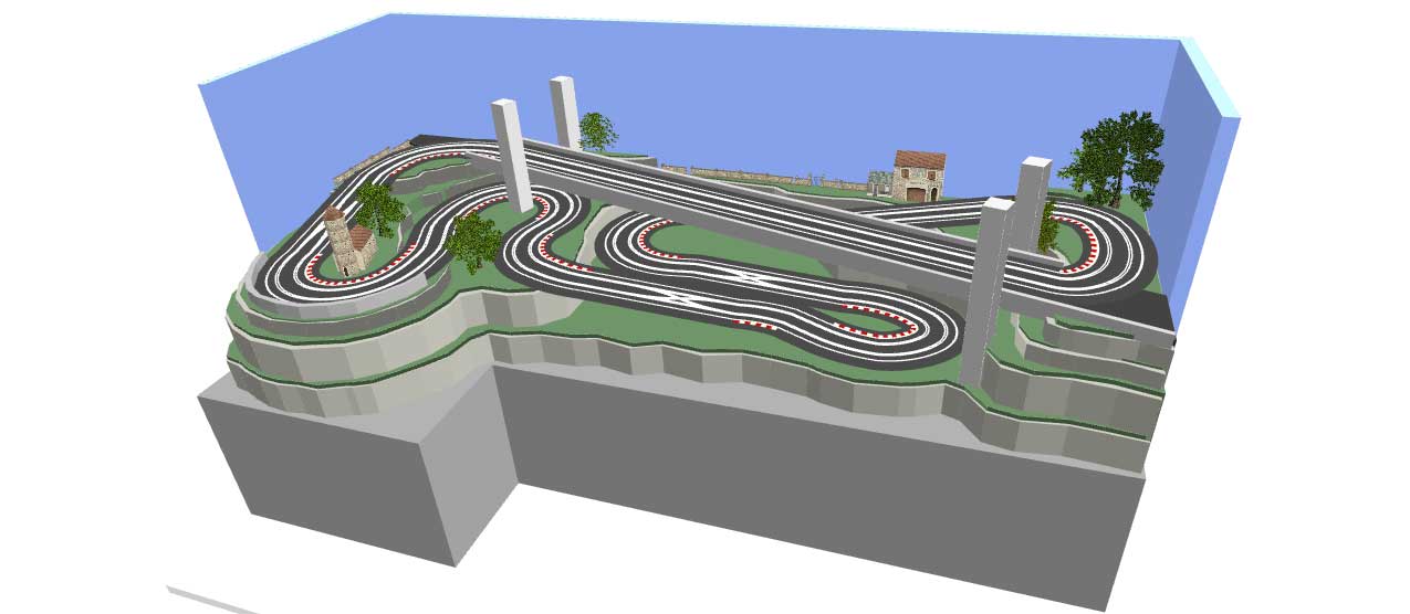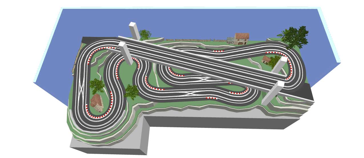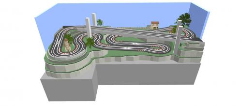 I always find T shaped tracks difficult to design, because the leg of the T always seems to make things awkward. However, if it's possible to make your layout more triangular, then more options open up. This one is 3.7m x 2.4m and has a 20cm elevation change, rising towards the back of the layout.