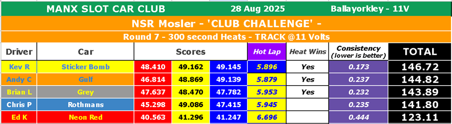 - Kev managed the best score in each lane, slightly quicker in Yellow and Blue but the main advantage was Red lane for a change.