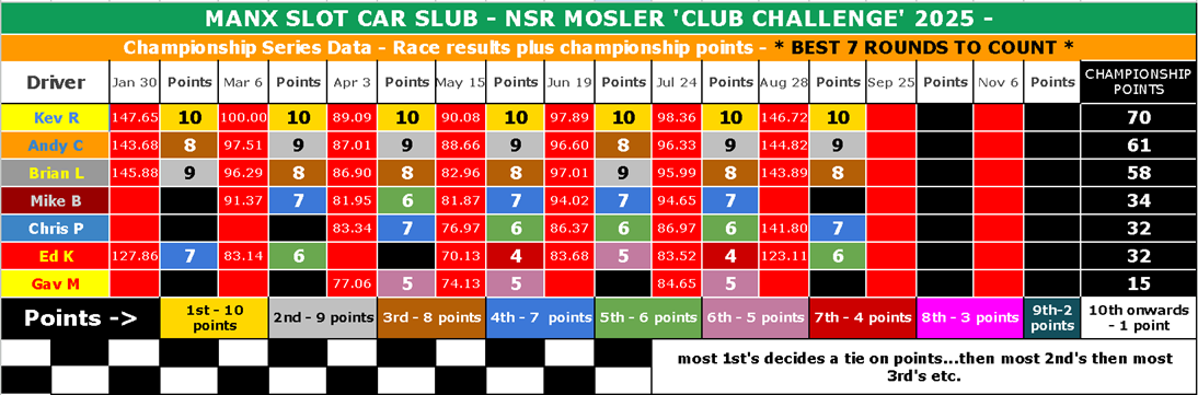 As far as the NSR Mosler ‘Club Challenge’ Championship is concerned, Kev, Andy & Brian have each got their ‘best 7 of 9’ results and will be dropping scores for the last two rounds, this will mean the gap to the top three cars will close significantly as the championship draws to an end.
