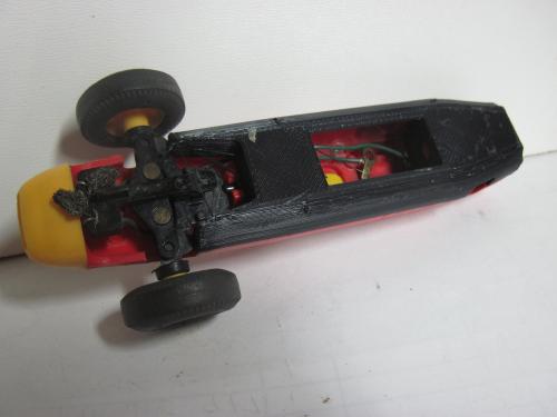 Scalextric Formula junior Porsche, trial print to check fit of the underpan. This will be similar to the Lotus using the FF050 slimline motor and the offsett Slot It cog arrangement.
