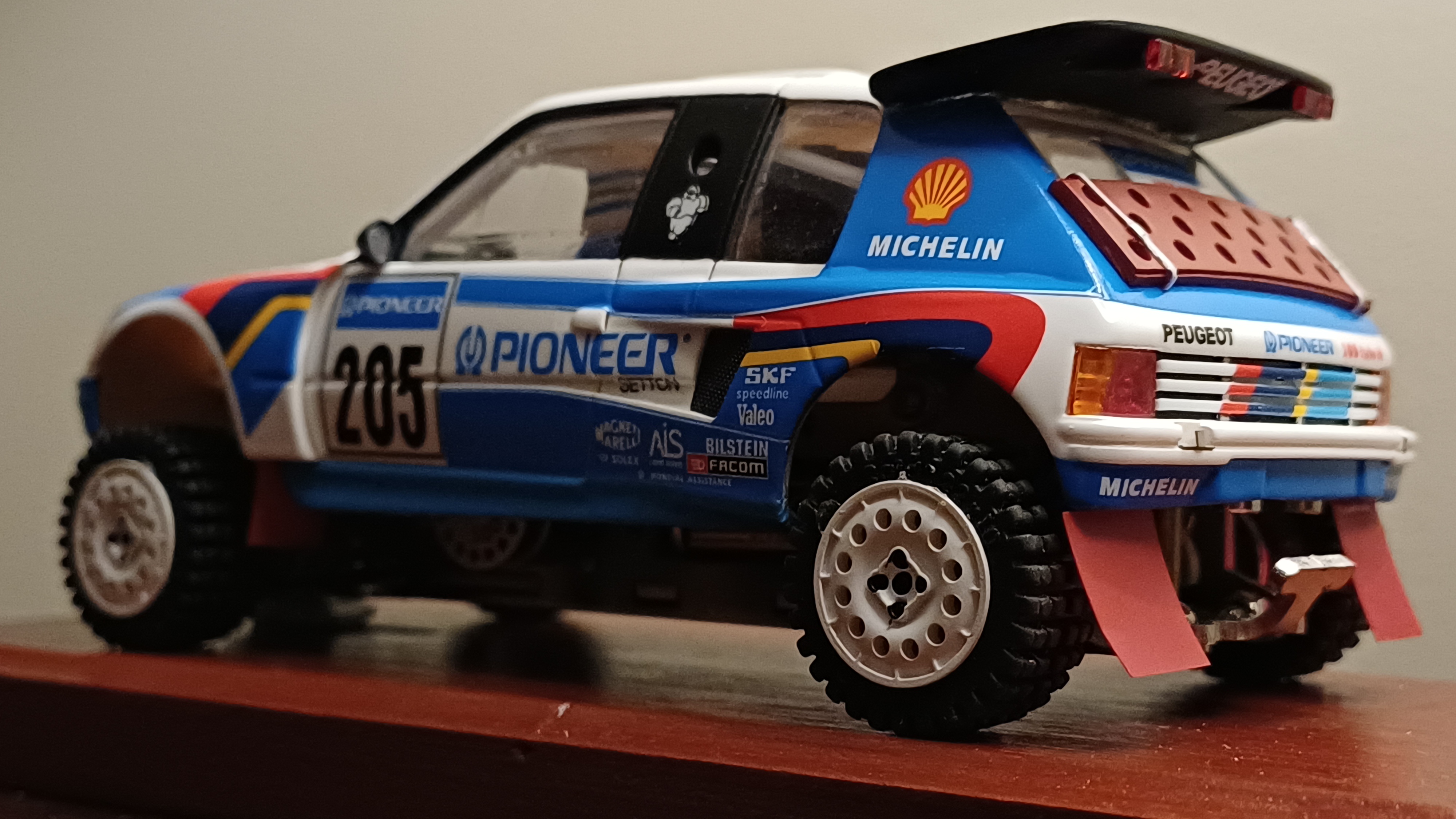 From the FOLM organisation, I have learnt that the body is from MSC/Scaleauto and was one of their 'Legend' series of Paris/Dakar cars. It's a resin body with fantastic detailing, now with decals for the numbers added. I also did a but of fettling underneath to make the body a better fit for the Mitoos chassis. It would have originally come with the plastic 'Dakar' chassis from MSC/Scaleauto, but that wasn't in my raffle prize, so I have put it on a metal chassis to try and create a semi-competitive Raid racer.