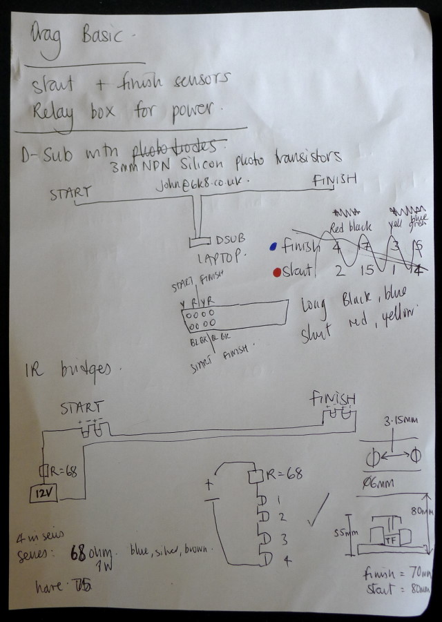 There was work I needed to do - making a sensor set-up to fit my seven-foot strip (yes, I've stretched it to 84-inches) and two IR LED gantries for the start and finish lines. Here's my working-out sheet...