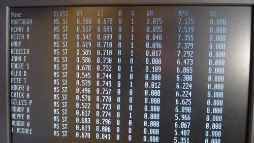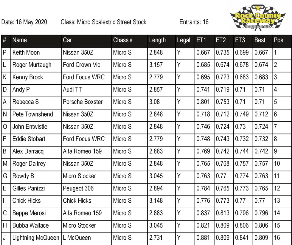 Murtaugh just couldn't nudge Moon from top spot. Andy and Rebecca tied on fastest time, but Andy gets fourth on a best second time. Both go through to a five-car Micro Scalextric Super Stock competition as I have 5 pairs of the tall .464 tyres.