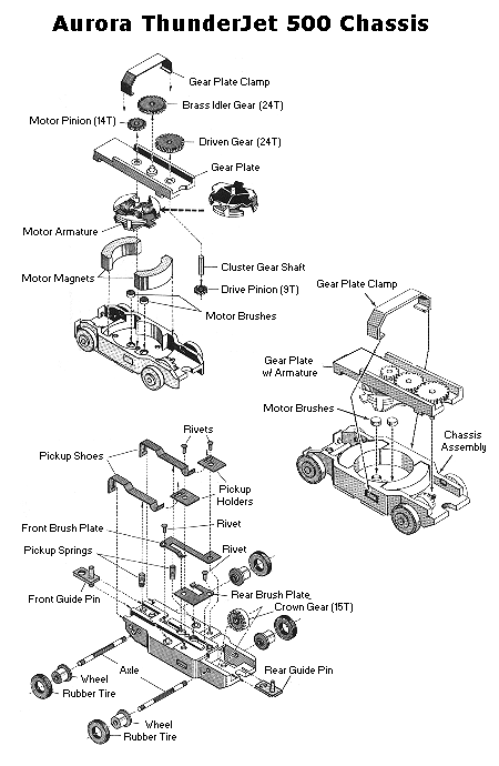 The Auto World Top Fuelers are a lot of fun. If you've never seen a 'pancake' chassis before, the mechanicals are simply bonkers. Here's an exploded view of a T-Jet chassis...