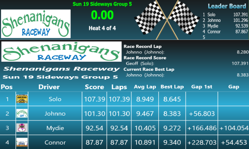 Leaderboard, Heat and Podium photo's of the racing for the Wednesday race group. Some very good improvements. We also welcome Andy to the group.