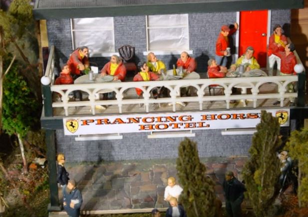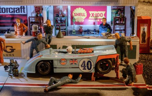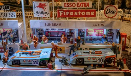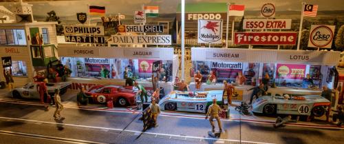 Here are some photos of 4 completed out 6 Workshop Garage kits now installed into the pits on the Goodwood section.