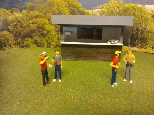 Managed to brave the heat in the shed and finish and position 6 of the Dylcom figures Infront of the snack bar (still not finished) .One problem though there's a destinct lack of serving staff people