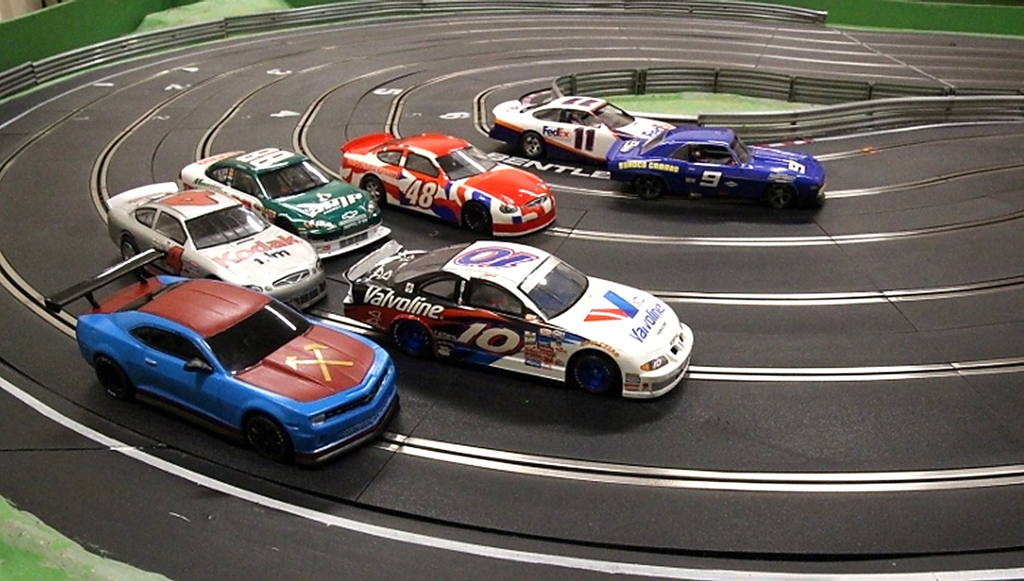 (Note the variety of cars being run from Carrera, Pioneer and Scalextric. 20k max motor levels the field.)