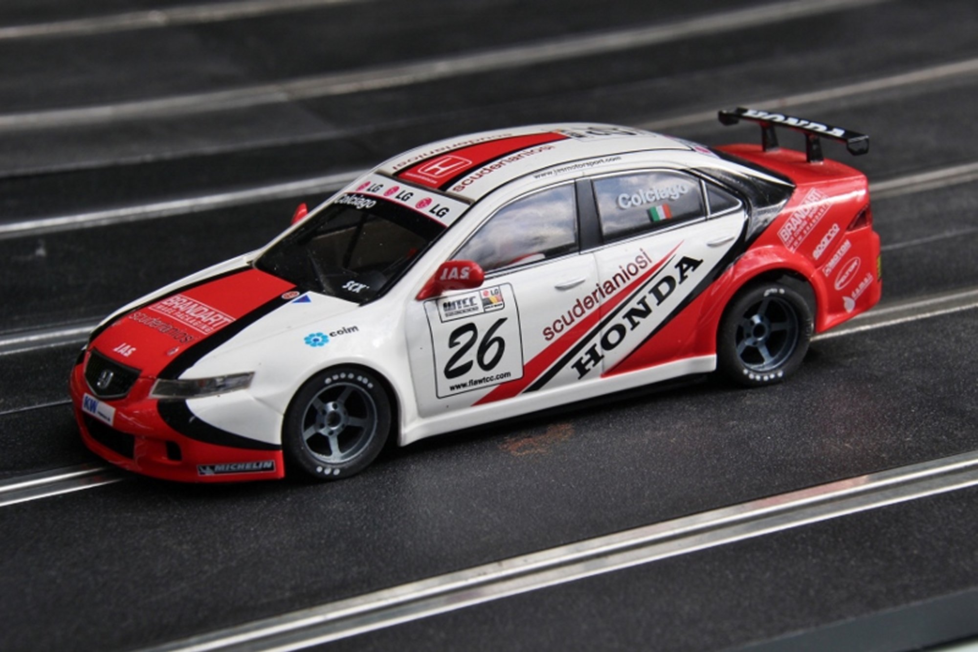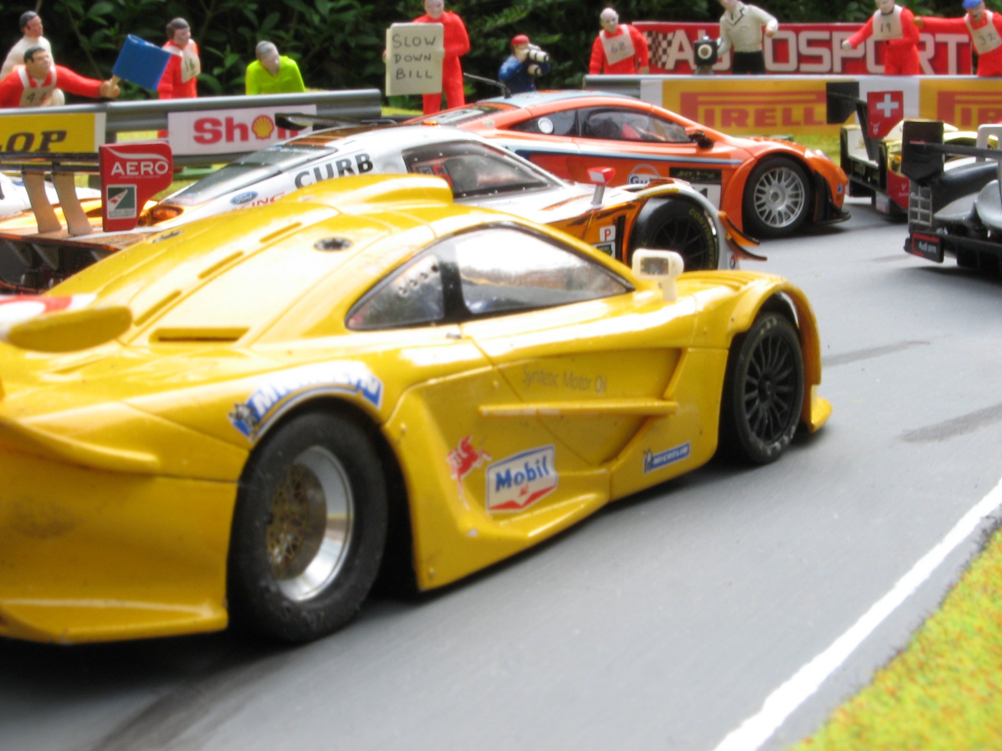 The colourful grid was made up from many 1:1 and 1:32 manufacturers with Ninco, Slot.it, NSR and modified Scalextric being represented.