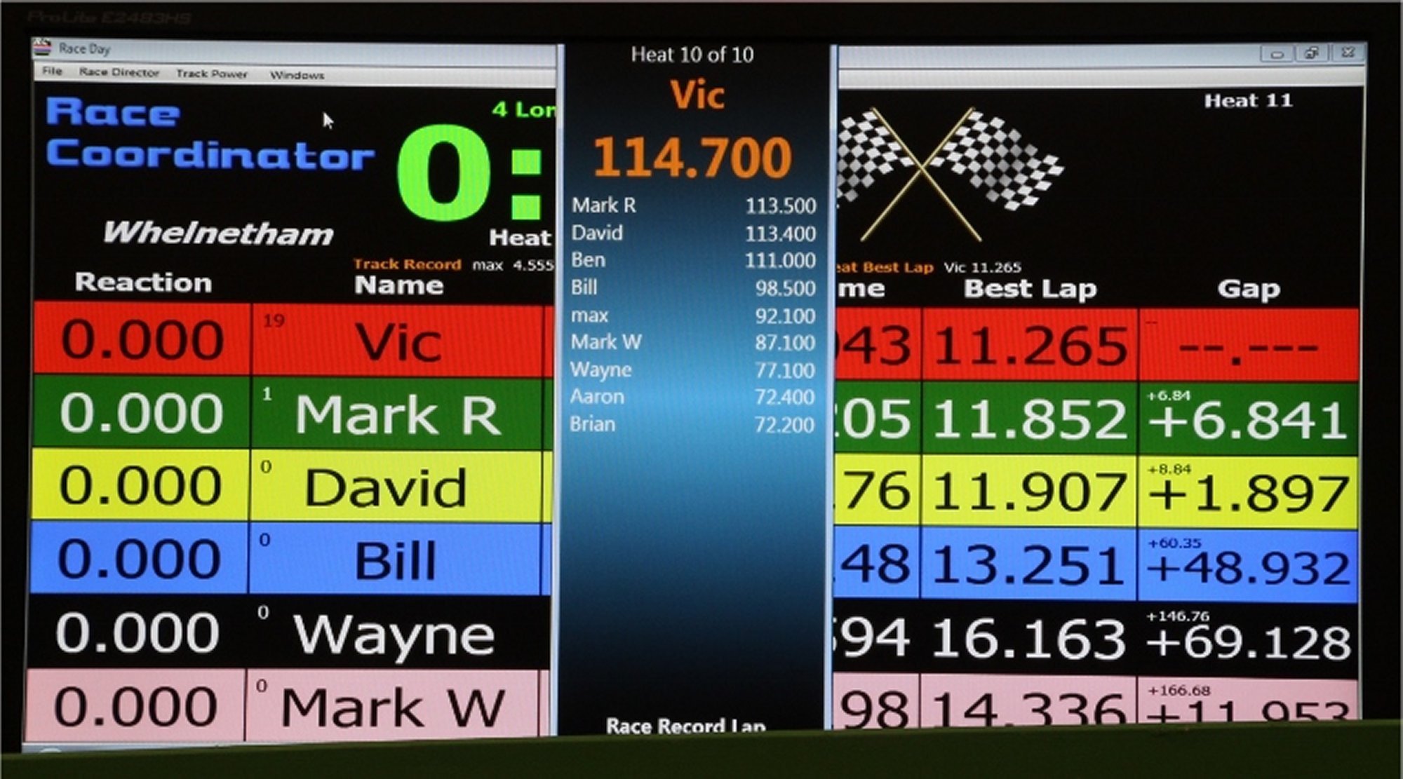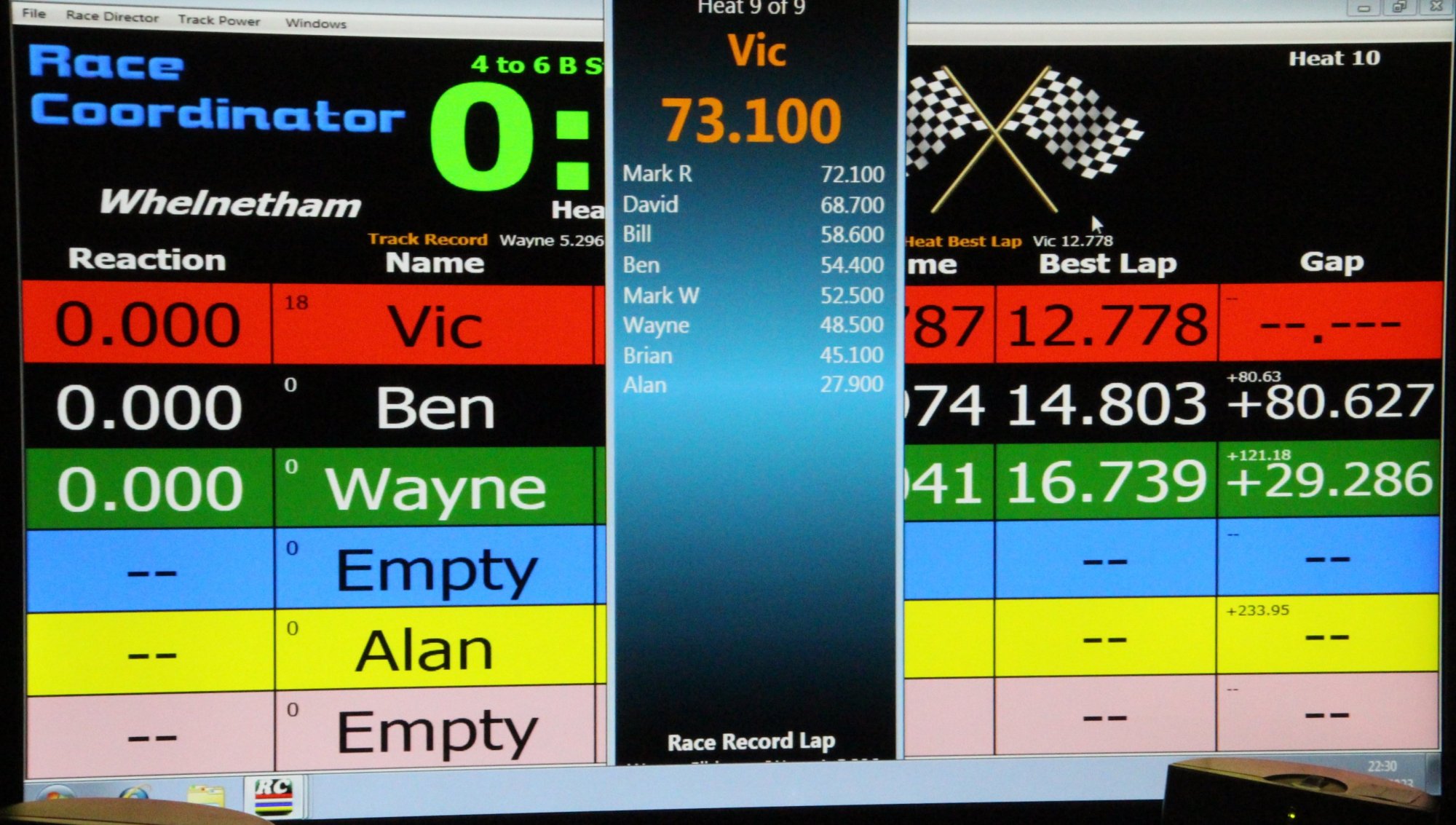 At the end of the session Race Coordinator showed just a third of a lap covering Alan and Brian tied for sixth and Wayne and Mark tied for seventh, ranking them on screen in order of their fastest laps.